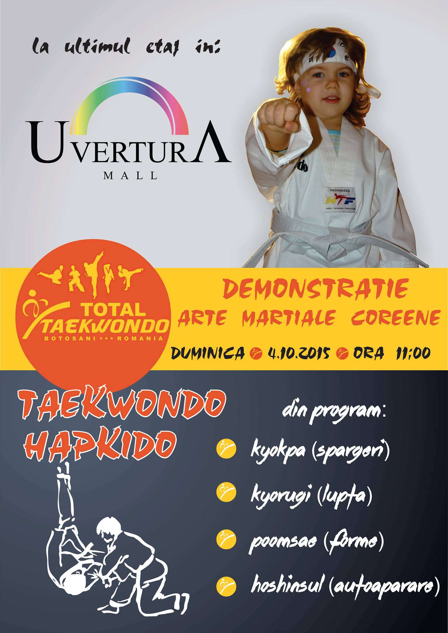 Duminică, 4 octombrie 2015, copiii și tinerii dornici de mișcare și interesați de arte marțiale sunt invitați de Clubul Sportiv TOTAL TAEKWONDO, să facă cunoștință cu artele marțiale coreene TAEKWONDO și HAPKIDO, urmând a vă prezenta într-o demonstrație atât latura marțială, cât și cea sportivă. Evenimentul face parte din campania “DESCOPERĂ ARTELE MARȚIALE COREENE” și se va desfășura începând cu orele 11:00, la etajul 4 al Uvertura Mall. Prin campania “DESCOPERĂ ARTELE MARȚIALE COREENE”, sunt oferite abonamente gratuite copiilor și adolescenților ce au vârste cuprinse între 5 și 17 ani.