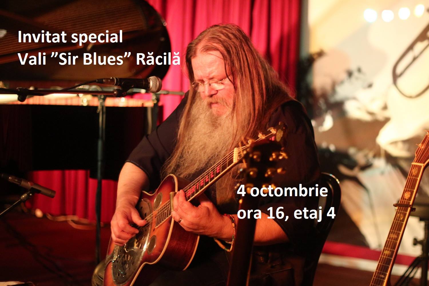Duminică, 4 octombrie, începând cu ora 16:00, la etajul 4 al Centrului Comercial, Uvertura Mall invită toate cadrele didactice, dar și pe toți cei ce vor să se bucure de acordurile muzicii invitatului special Vali ”Sir Blues” Răcilă, care va concerta timp de 60 de minute, pentru a marca Ziua Internațională a Profesorului. *Cunoscut sub apelativul Sir Blues , muzicianul, actorul ( a activat peste 22 ani la Teatrul Mihai Eminescu din Botosani ) şi socio-psihologul Vali Răcilă este un fidel interpret al blues-ului tradiţional acustic de peste Ocean. Prin stilul său muzical, artistul reînvie sunetul blues-ului de acum aproape o sută de ani, de pe plantaţiile de bumbac din America. Vali Răcilă foloseşte alternativ patru chitare, mânuite cu tehnici diferite precum slide sau fingerpicking, acompaniindu-şi astfel interpretările vocale. Colaborarea sa cu pianistul Raul Kusak s-a materializat în 2011 prin albumul Handmade Blues, produs de Nicu Alifantis.