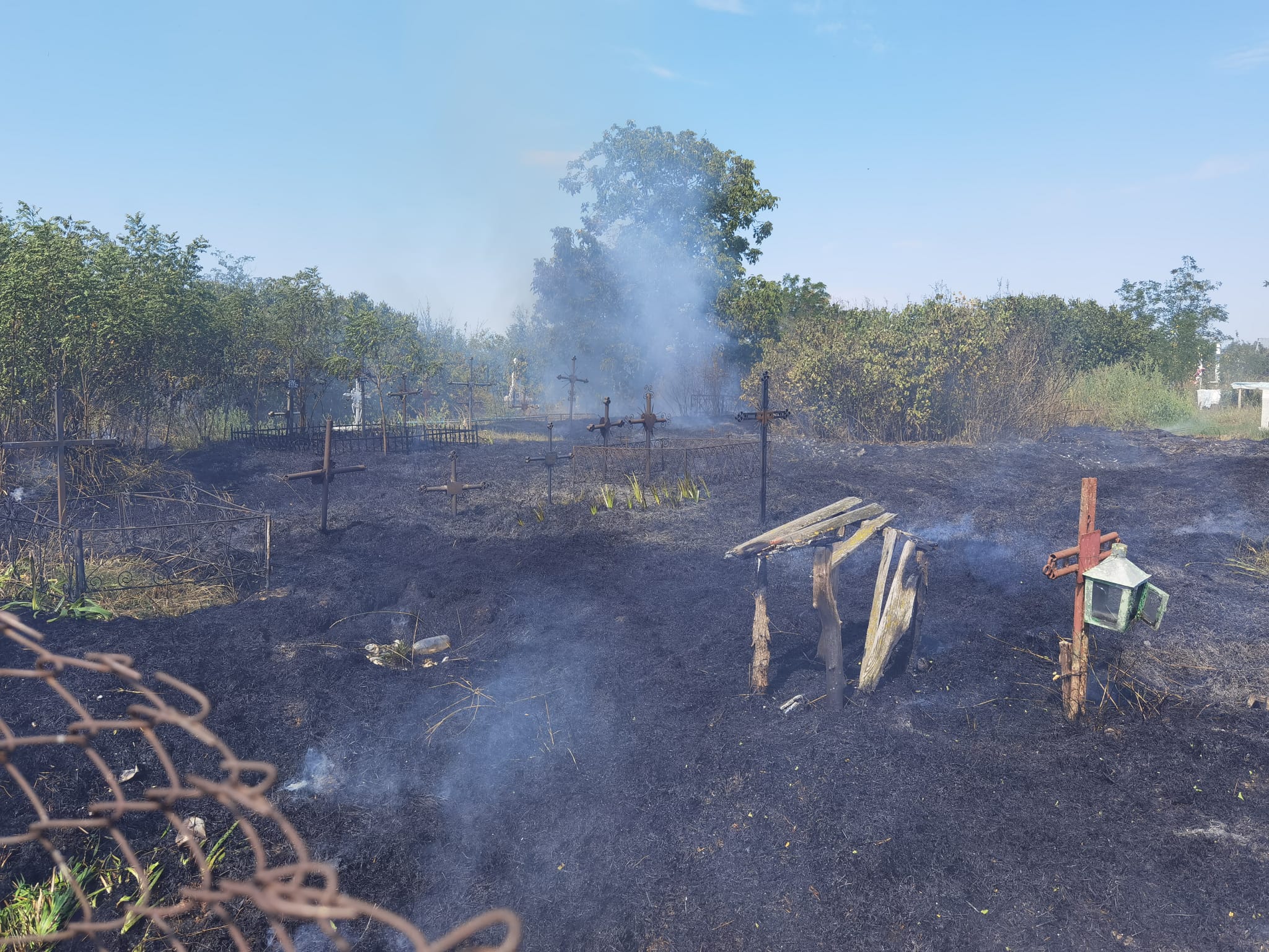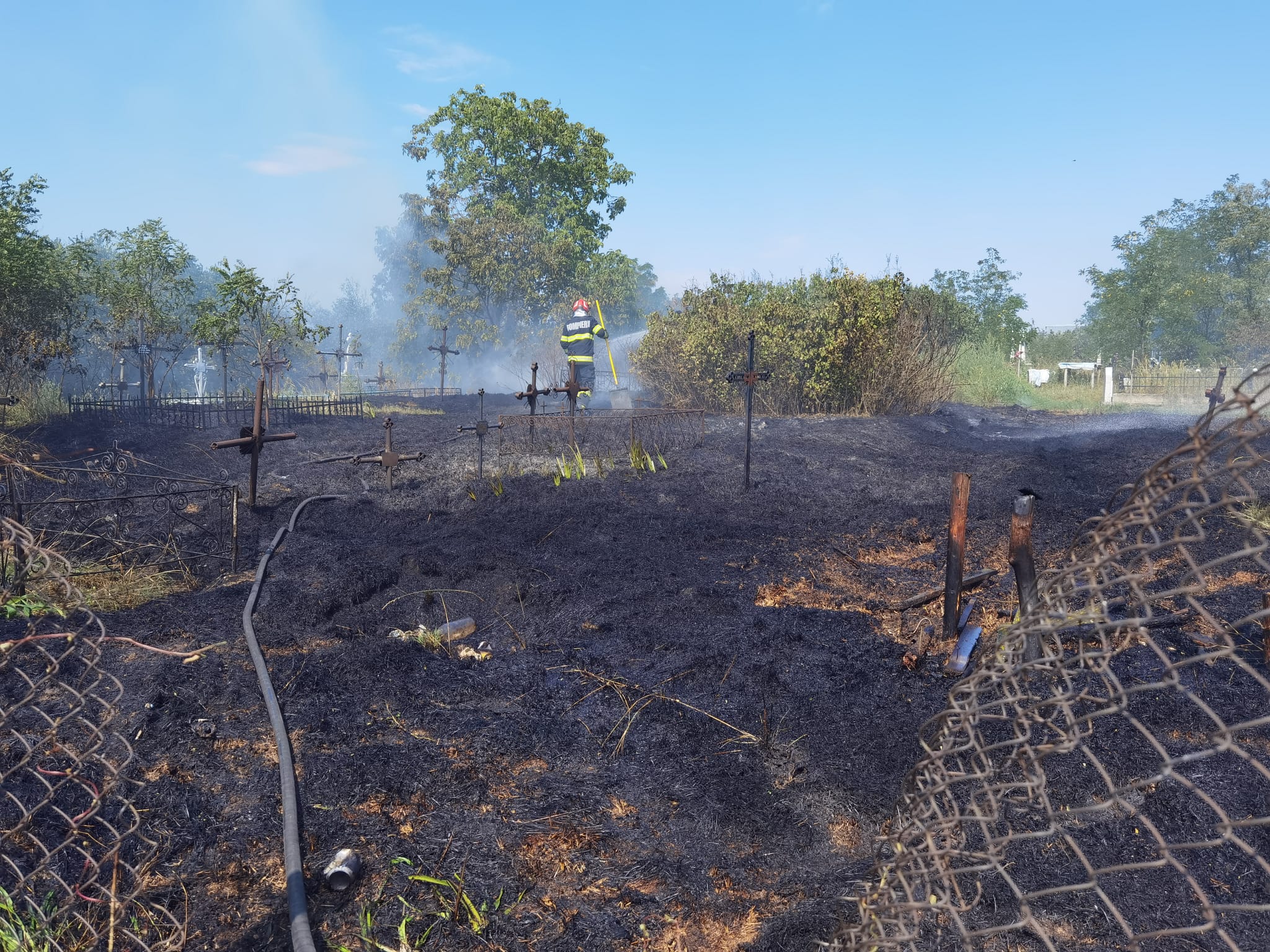 Aceștia au constatat că ardeau violent vegetația uscată, crucile din lemn și coroanele așezate pe morminte. Pompierii au acționat rapid astfel încât flăcările să nu se extindă la întregul cimitir, dar și la mai multe utilaje agricole și un depozit de cereale. Suprafața afectată a fost estimată la aproximativ două hectare.