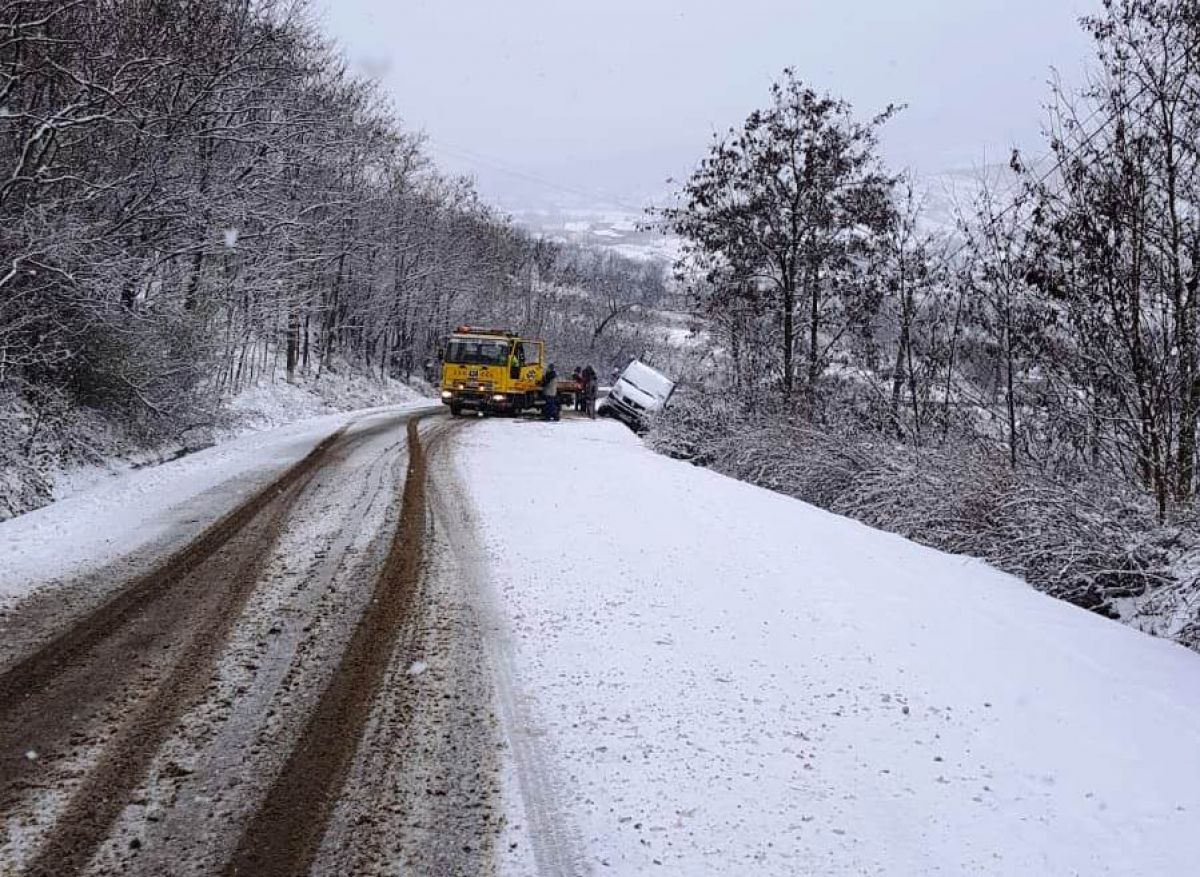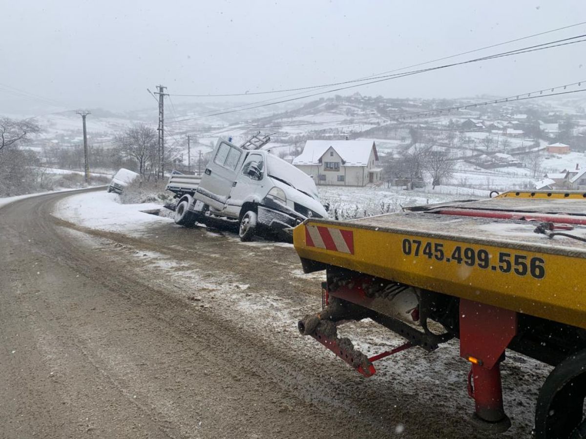 O autoutilitară și o dubiță au ieșit în decor din cauza poleiului. S-a întâmplat pe raza localității Cerbu din comuna Copălău.