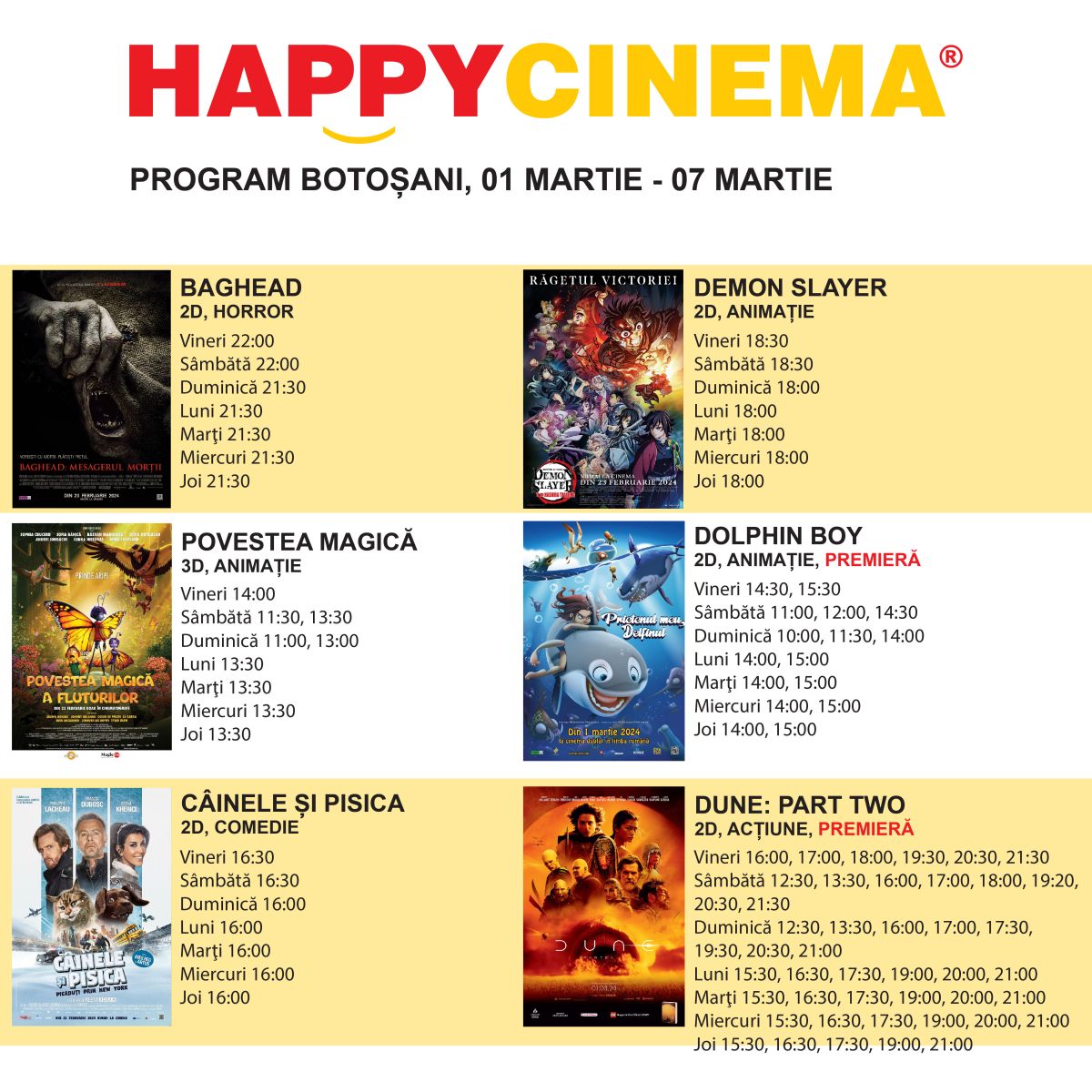 Happy Cinema Botoșani a transmis programul pentru săptămâna 1 -7 martie 2024.