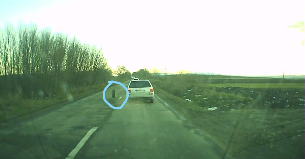 Mașina rămasă fără roată se mai deplasează câțiva metri apoi oprește, la fel și autoturismul din spate. Roata se rostogolește pe șosea, apoi ajunge în afara carosabilului.