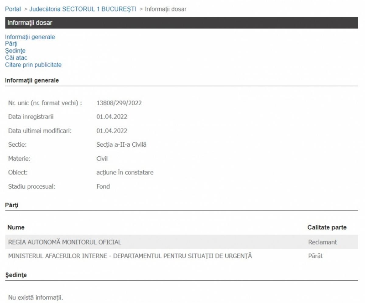 Regia Autonomă Monitorul Oficial a dat în judecată Departamentul pentru Situații de Urgență din cadrul Ministerului Afacerilor Interne.