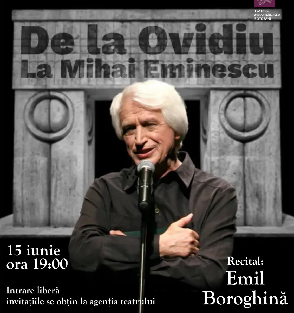 De la ora 19:00, Emil Boroghină (Teatrul din Craiova) va susține recitalul „De la Ovidiu la Eminescu” (regia Alina Hiristea) la Teatrul „Mihai Eminescu” din Botoșani. Intrarea este liberă, în limita locurilor disponibile.