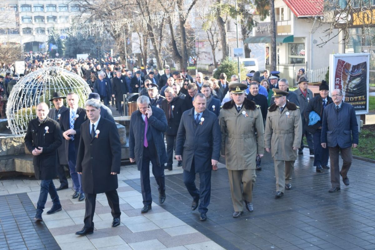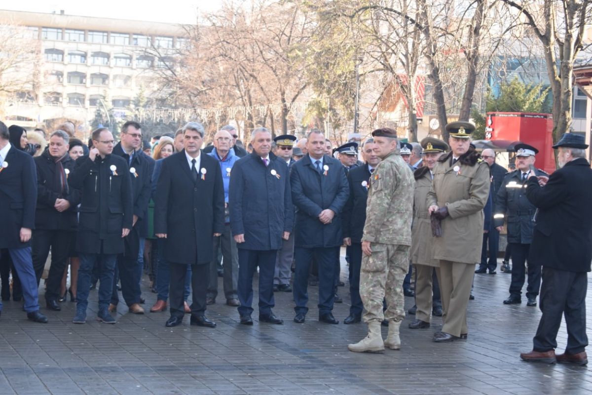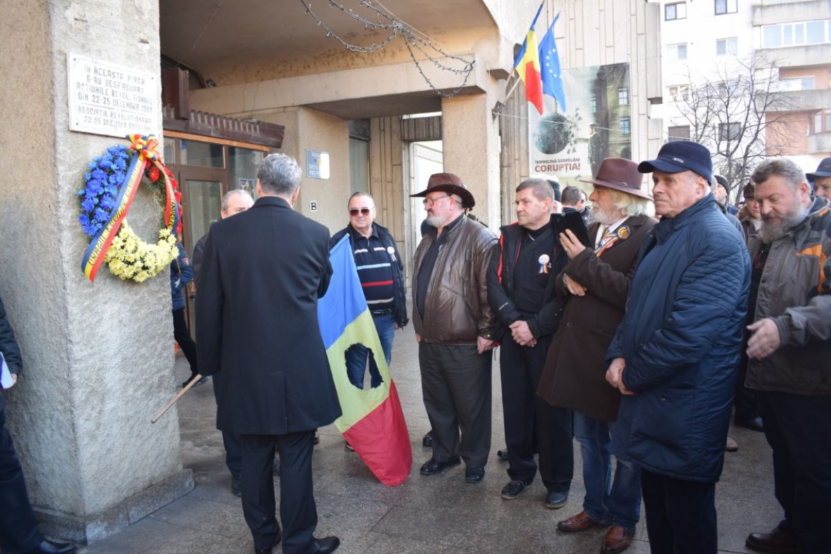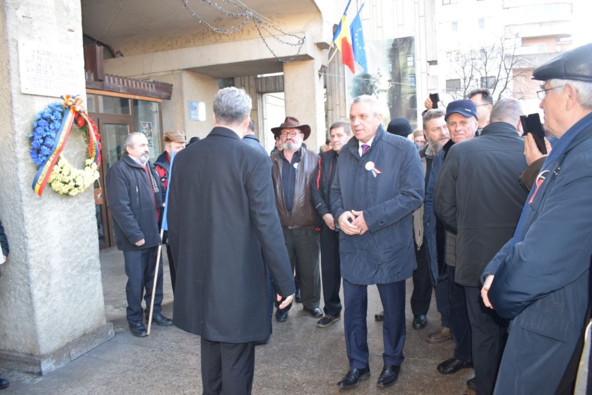 La 11:15 a fost programat primul eveniment dedicat Revoluției, la placheta de pe Palatul Administrativ și până la sosirea oficialitățile pe esplanadă, șirul de ansambluri de la paradă a fost blocat undeva pe traseu, pentru a nu ajunge în fața Consiliului Județean unde era marcat evenimentul actual. Ceea ce a dus la paralizarea traficului rutier și o aglomerație de nedescris în centrul orașului.