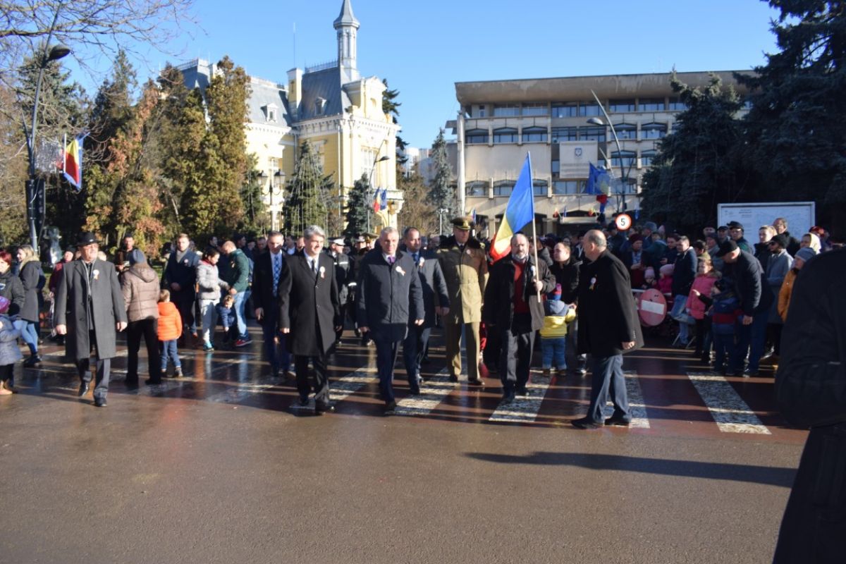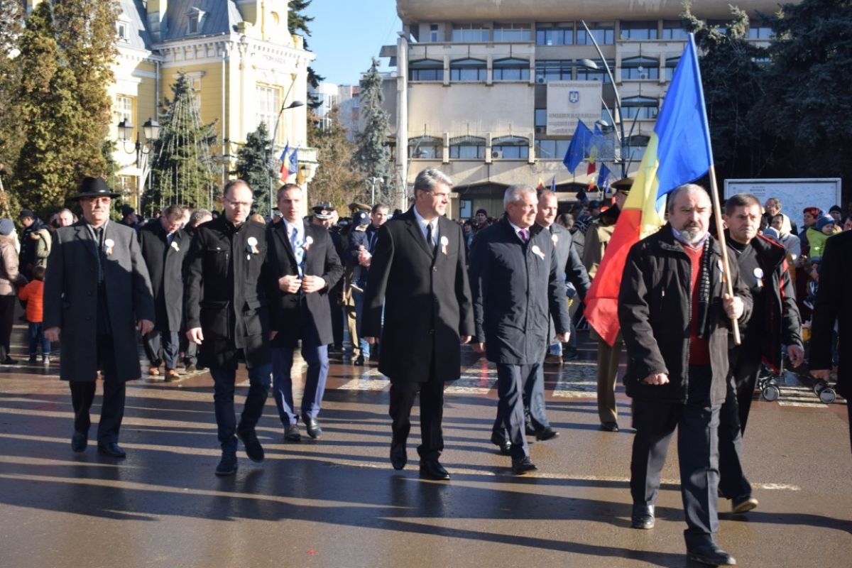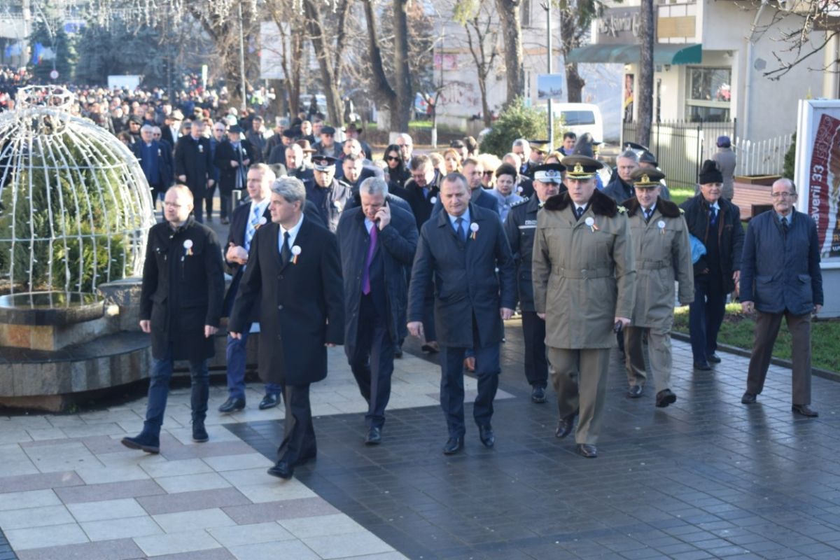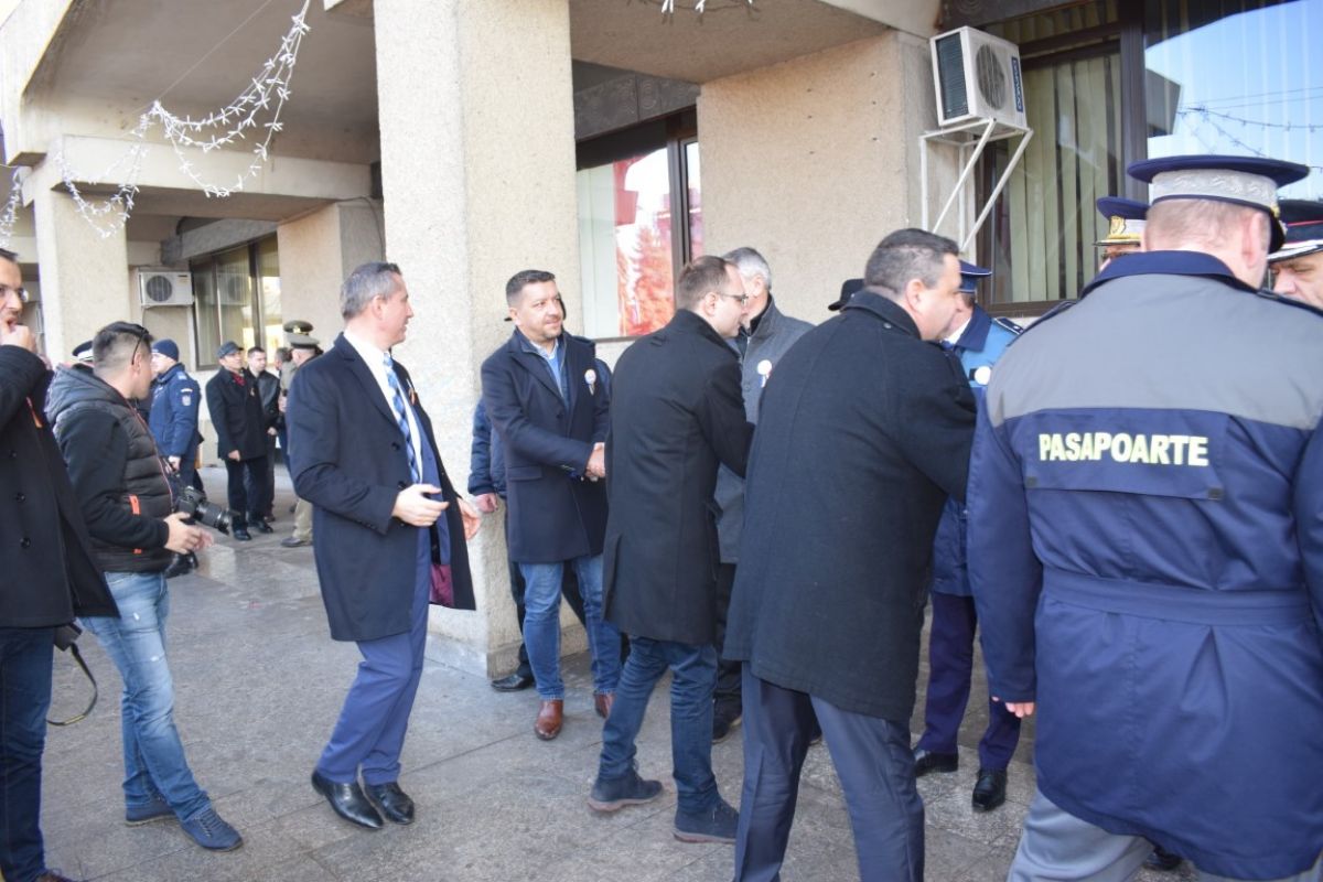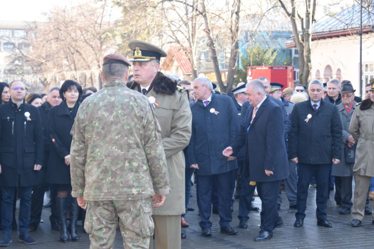 La 11:15 a fost programat primul eveniment dedicat Revoluției, la placheta de pe Palatul Administrativ și până la sosirea oficialitățile pe esplanadă, șirul de ansambluri de la paradă a fost blocat undeva pe traseu, pentru a nu ajunge în fața Consiliului Județean unde era marcat evenimentul actual. Ceea ce a dus la paralizarea traficului rutier și o aglomerație de nedescris în centrul orașului.