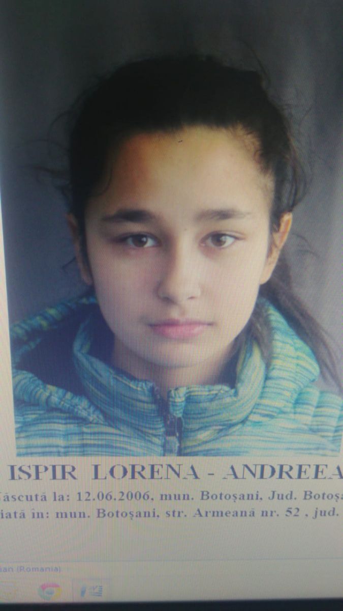 Cadrele Inspectoratului de Poliție Județean (IPJ) Botoșani o caută pe Ispir Lorena Andreea, în vârstă de 14 ani.