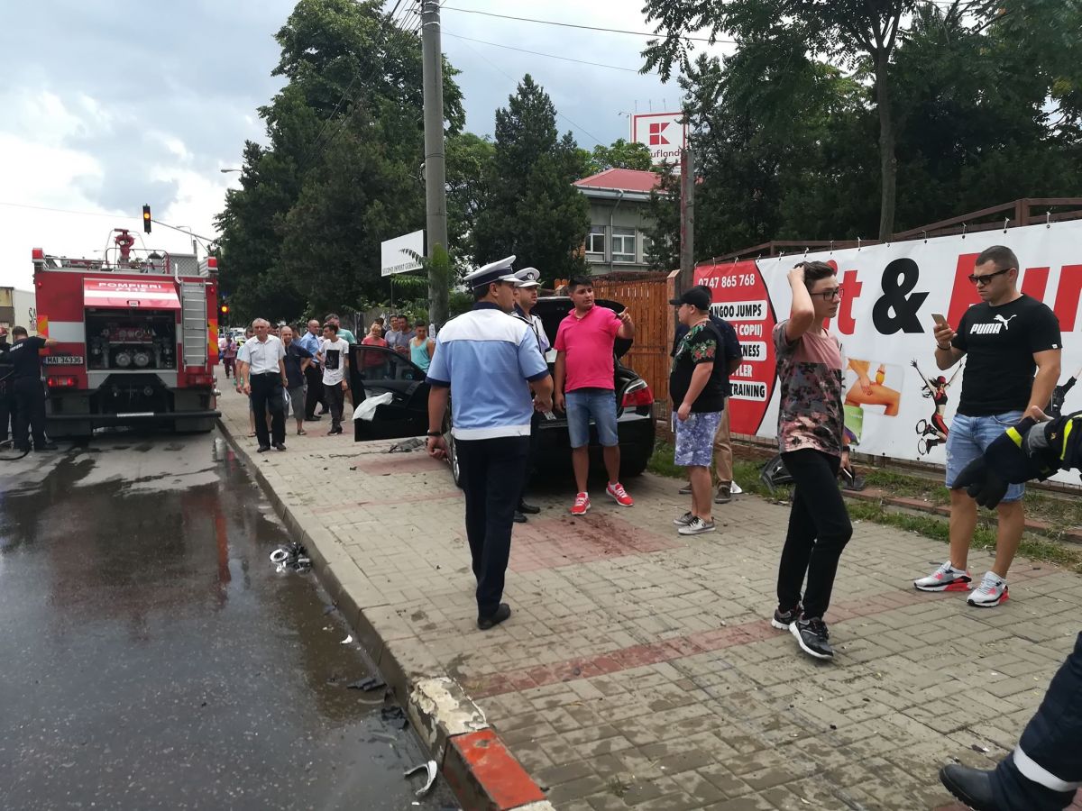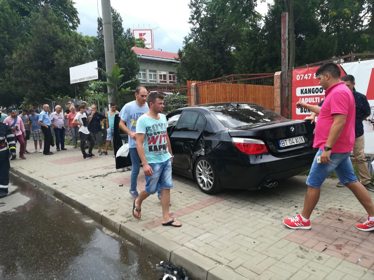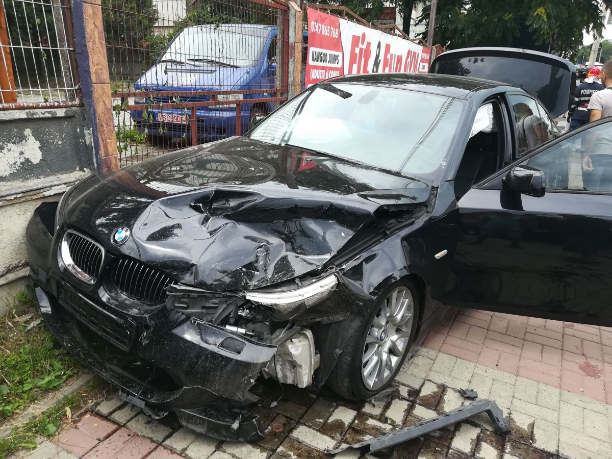 În urma impactului tânărul aflat la volanul BMW-ului a tras puternic de volan dreapta, a urcat pe trotuar și s-a oprit într-un gard.