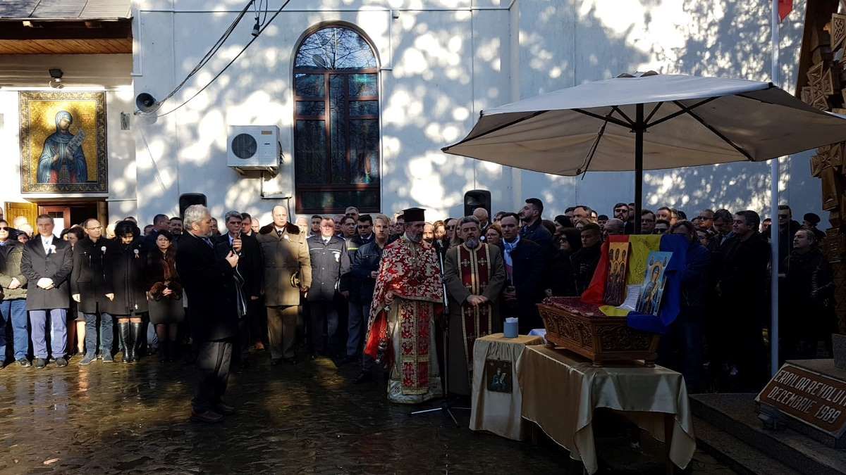 La troița din curtea bisericii are loc la această oră o slujbă religioasă oficiată de părintele Grigore Diaconu și de preotul militar Ștefan Grădinaru.