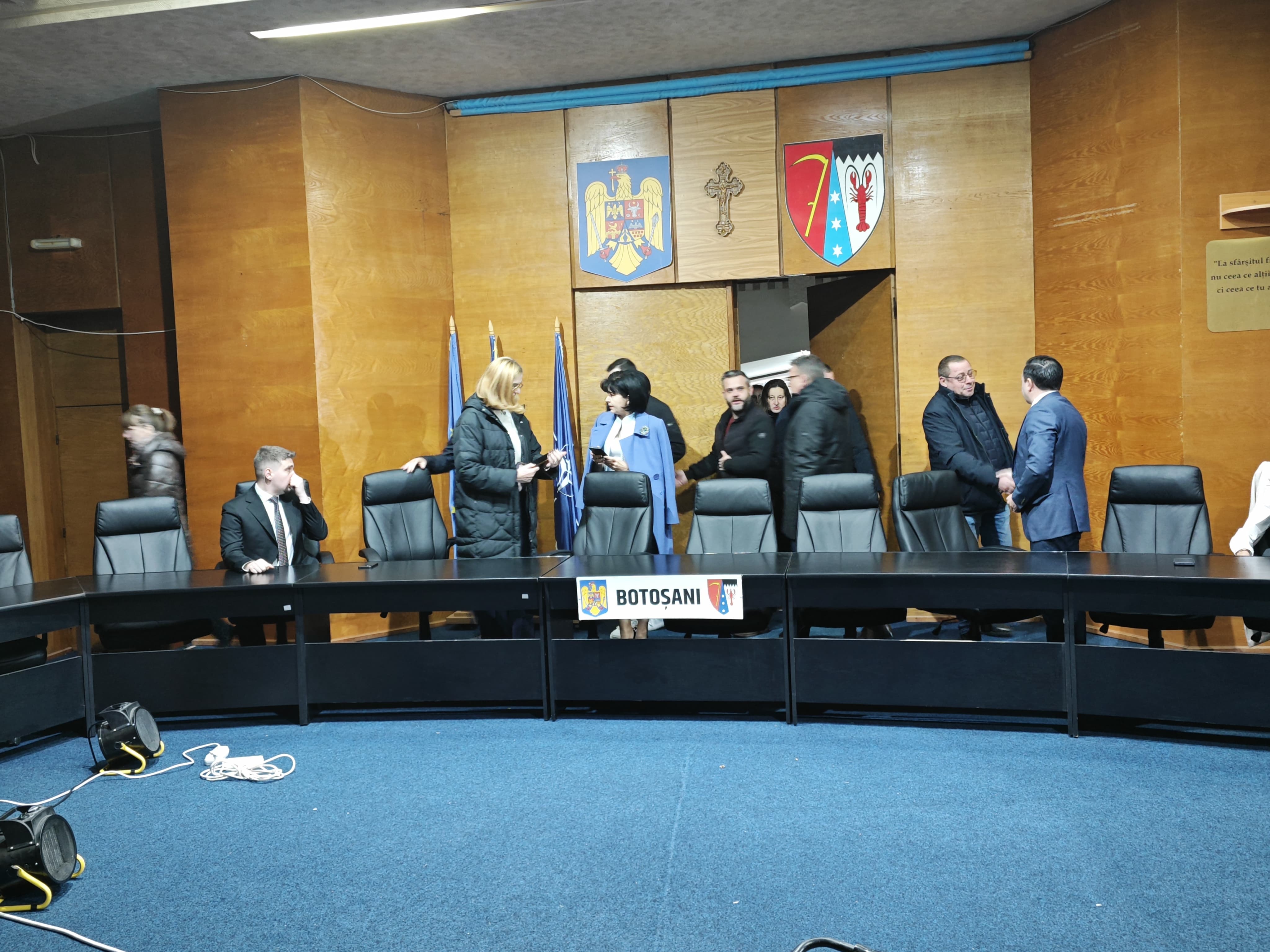 La ceremonie sunt prezenți membri ai echipelor de la PSD, PNL și AUR, inclusiv primarul municipiului Botoșani, Cosmin Andrei.