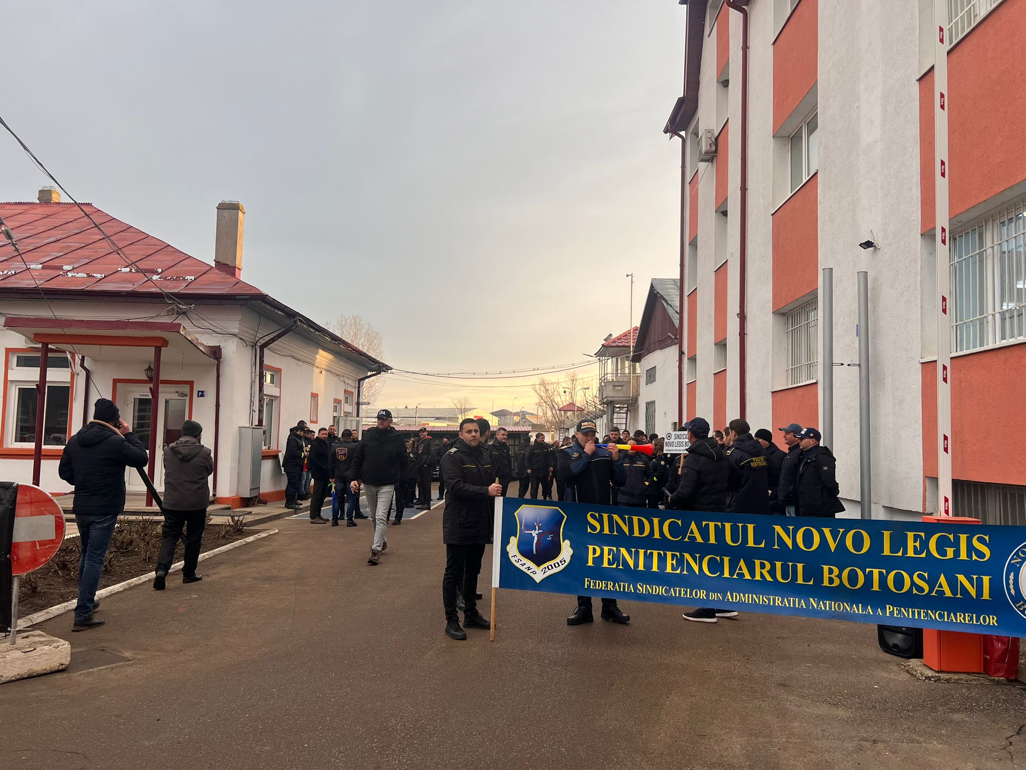 Angajații sunt adunați în fața unității de detenție și suflă în vuvuzele.