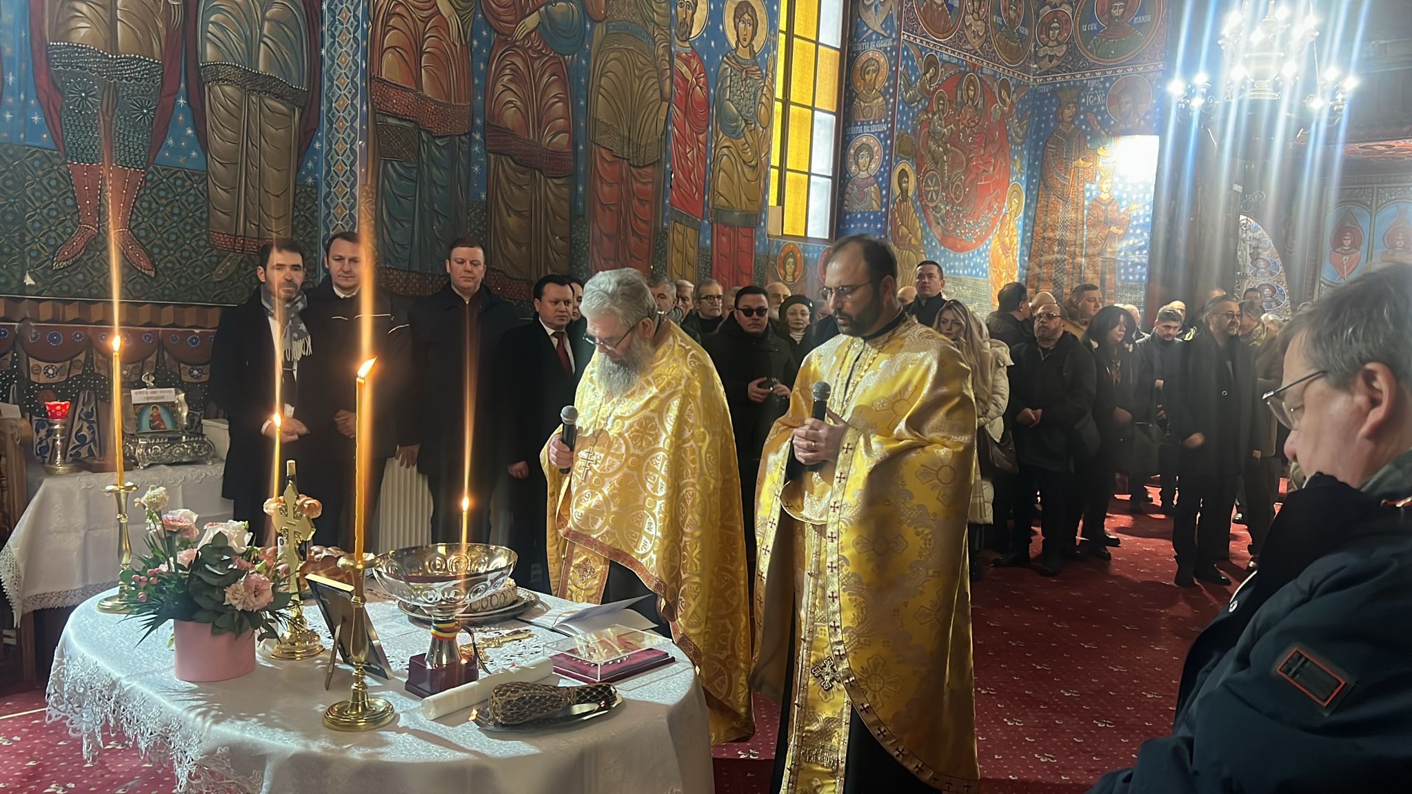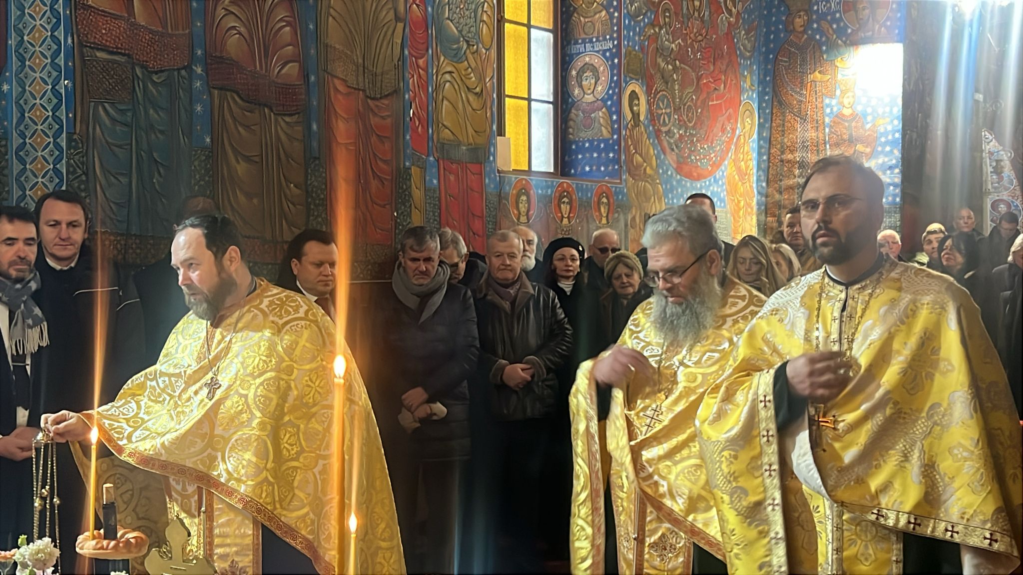 Slujba este oficiată de trei preoți în frunte cu protopopul Petru Fercal. Dintre oficialități participă prefectul Raluca Curelariu, președintele Consiliului Județean Valeriu Iftime, primarul Cosmin Andrei.