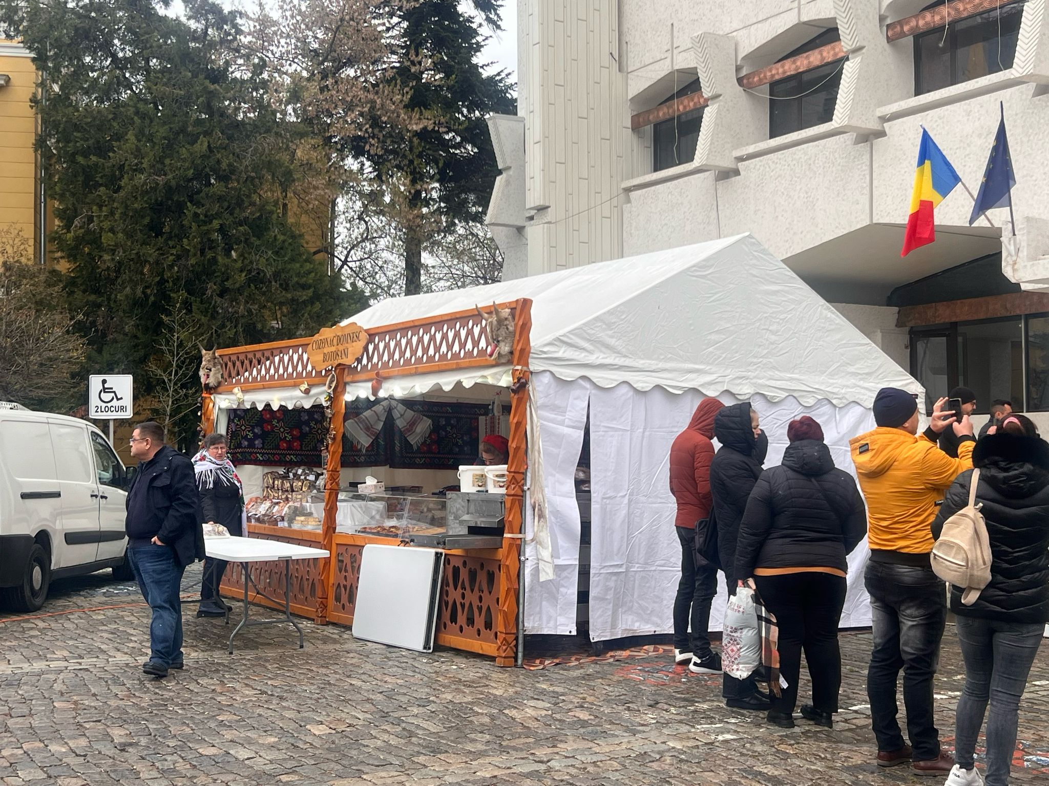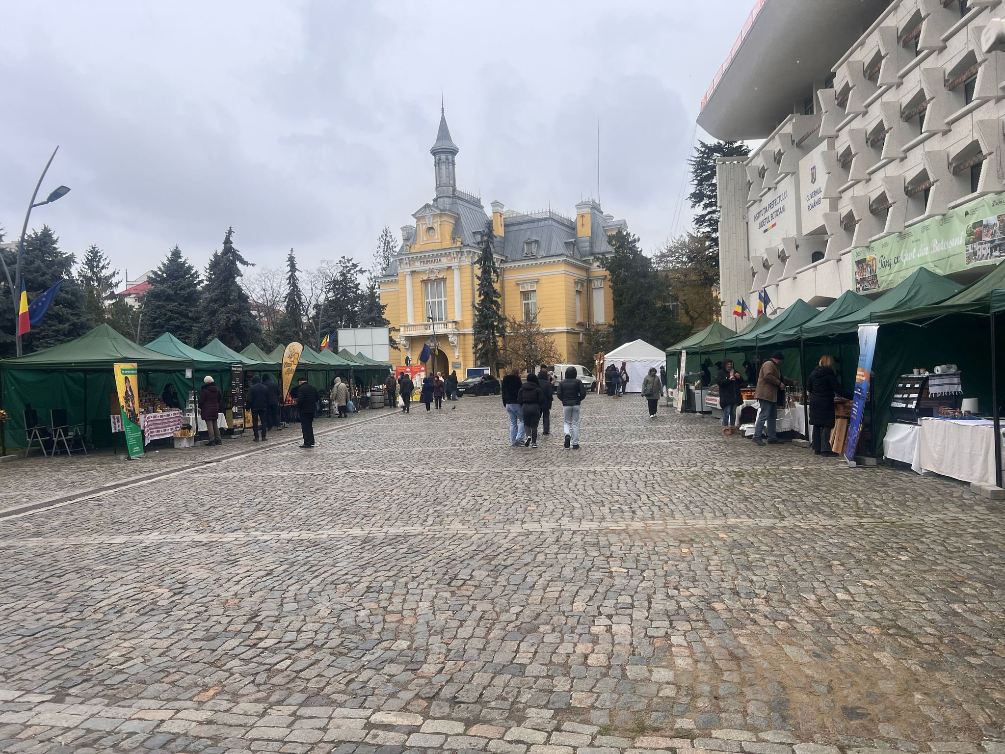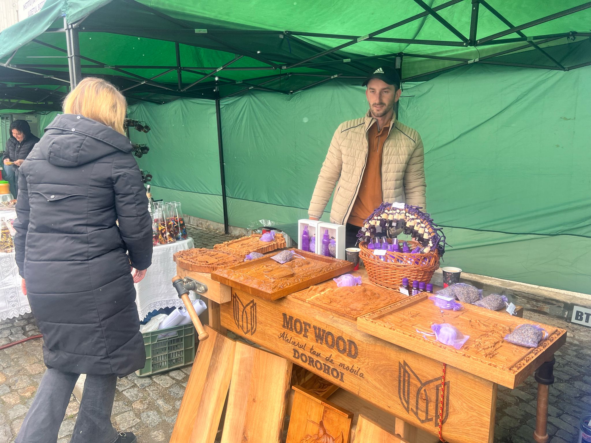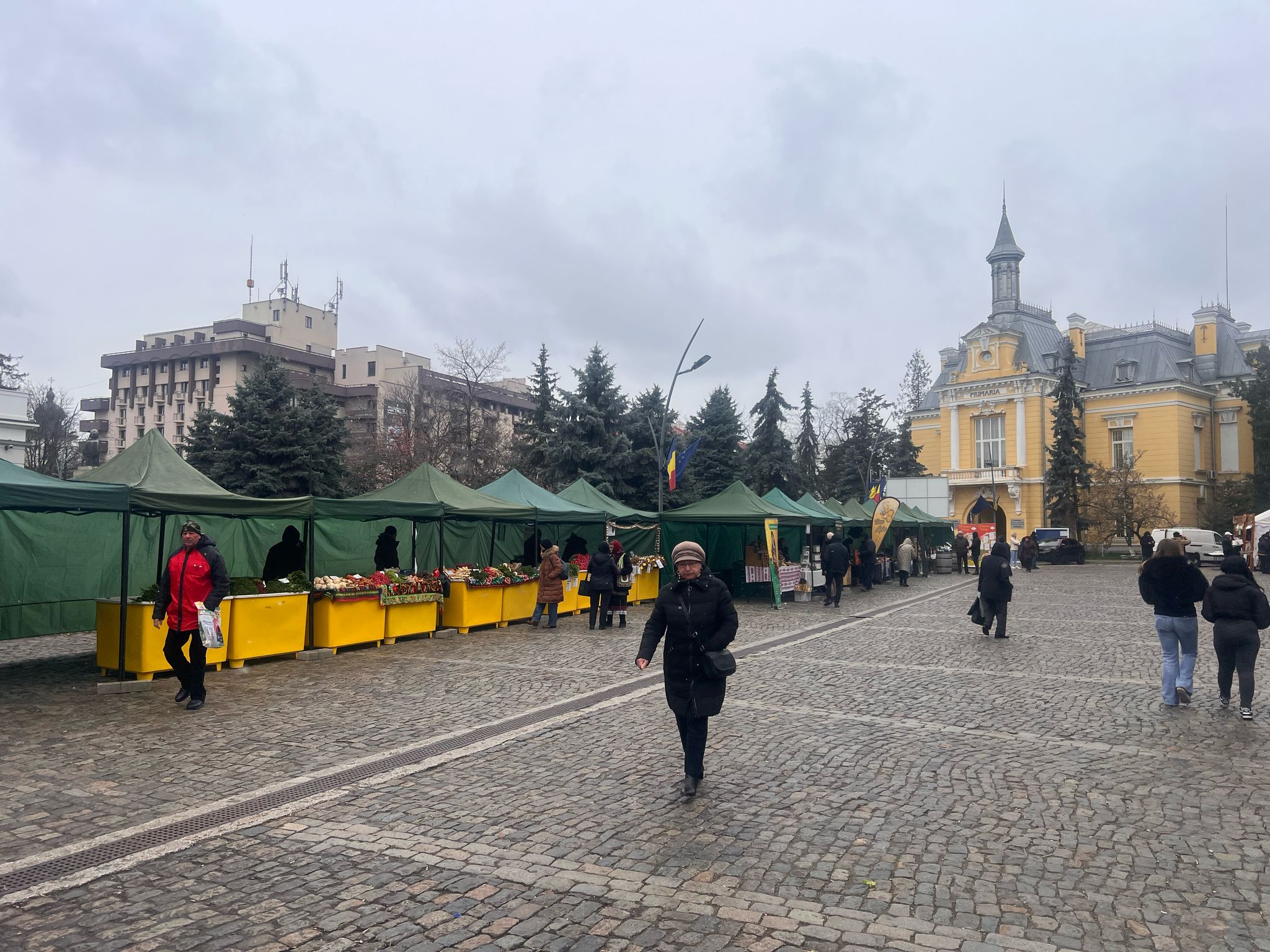 În Piața Revoluției de la Botoșani au fost amenajate peste 20 de standuri cu tot felul de produse. De la pește, legume, miere, sucuri naturale până la produse din patiserie, brânzeturi, ouă sau mezeluri.