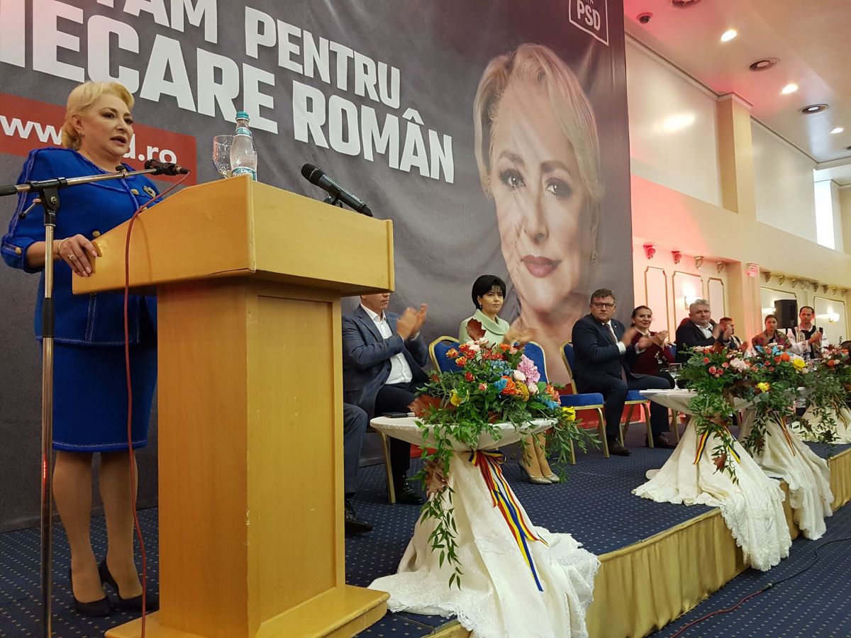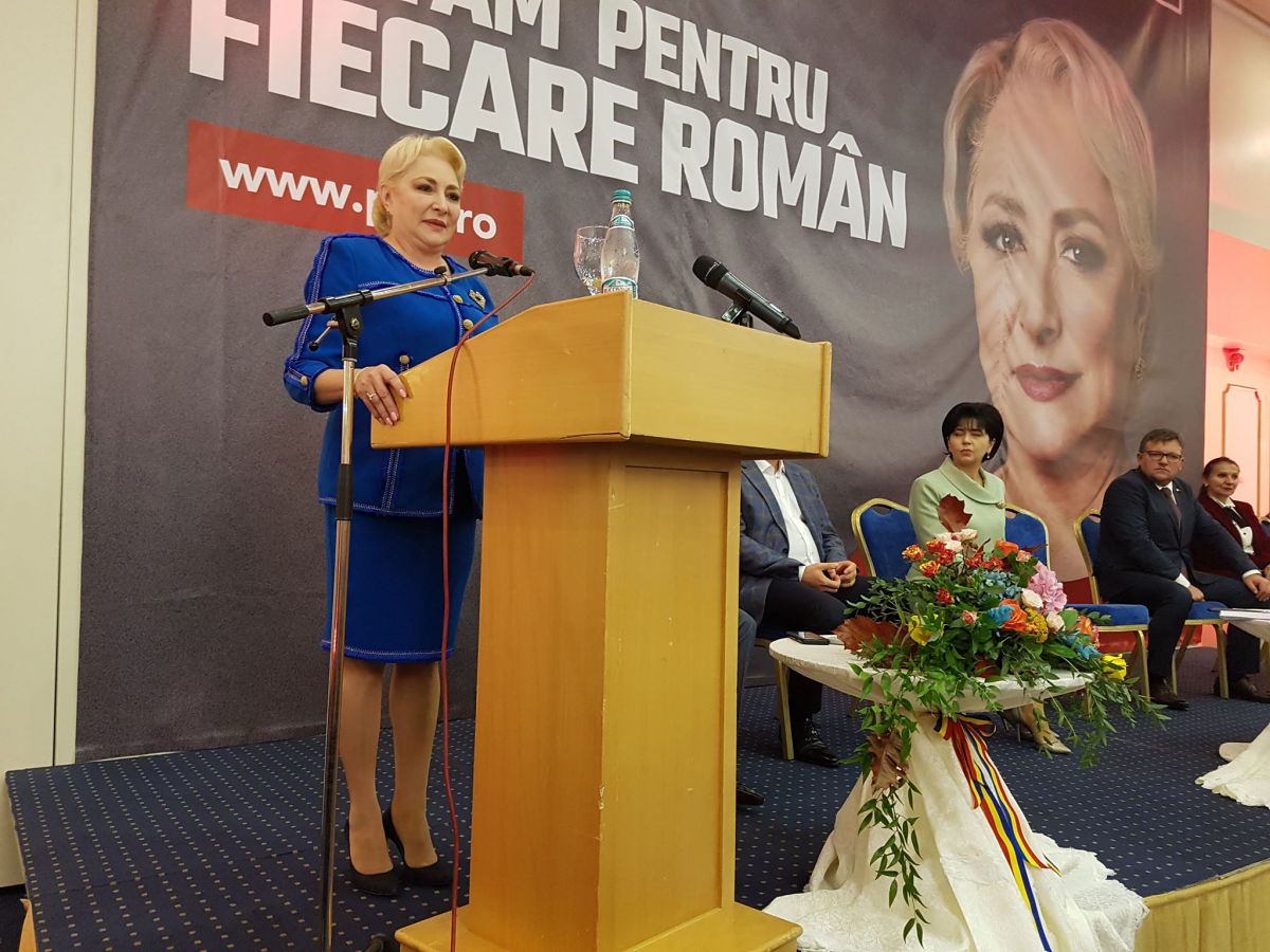 Cei din sală o ascultă cu atenție, mai ales că discursul Vioricăi Dăncilă este cursiv, aceasta vorbind liber, fără a citi de pe hârtii.