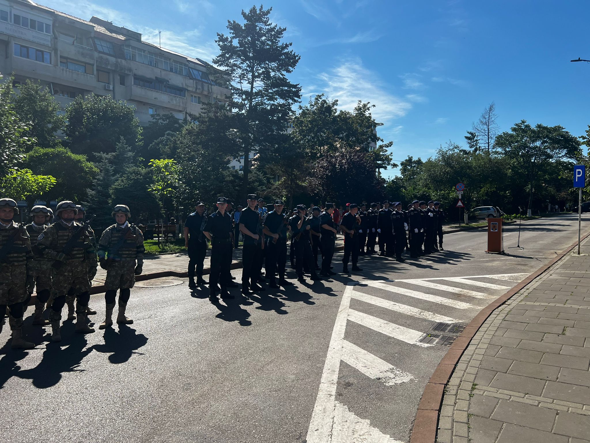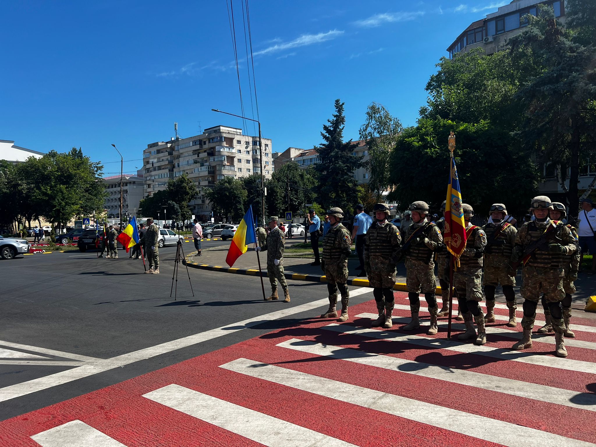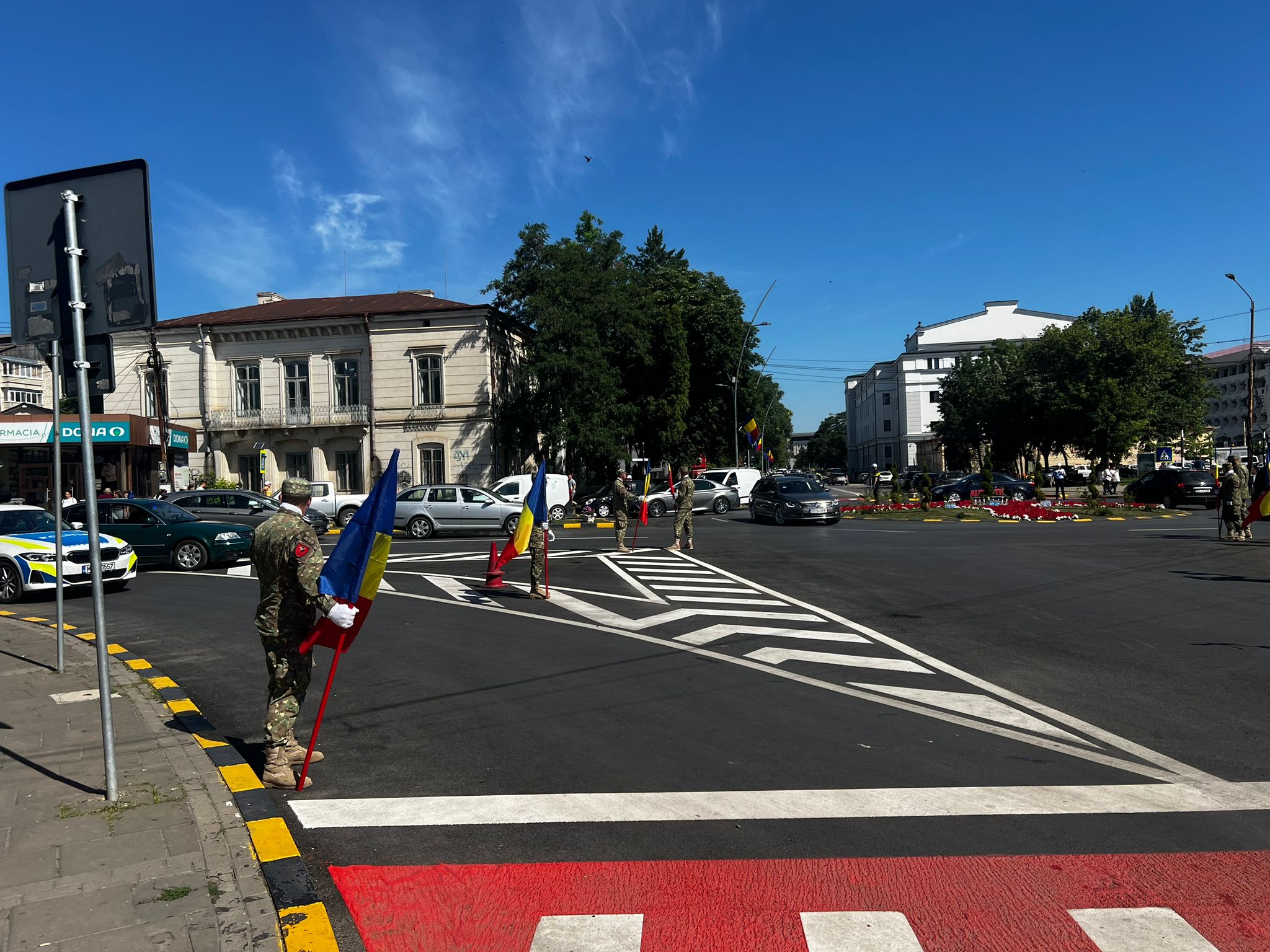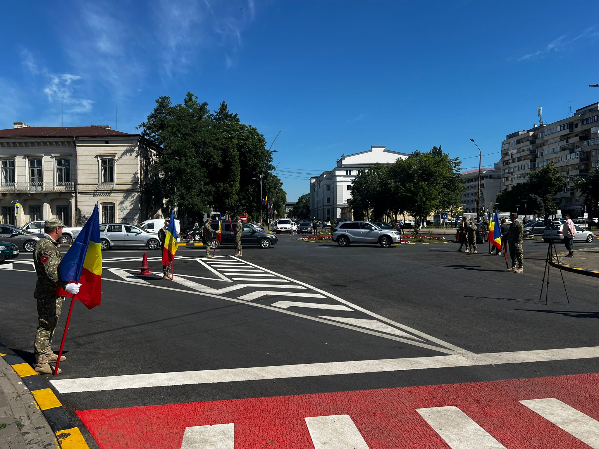 În sensul giratoriu de la Casa Sindicatelor, Garda de Onoare s-a așezat deja pe poziții în așteptarea oficialităților județului și orașului.