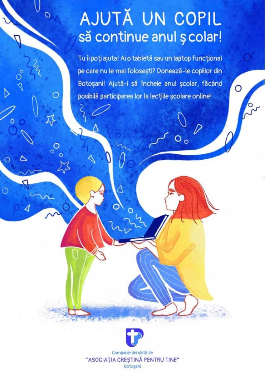 „Știai că în județul Botoșani există mii de copii aflați în imposibilitate de a continua anul școlar pentru că nu se pot conecta la orele online? Tu îi poți ajuta! Ai o tabletă sau un laptop funcțional pe care nu le mai folosești? Donează-le copiilor din Botoșani! Ajută-i să încheie anul școlar, făcând posibilă participarea lor la lecțiile școlare online! Puteți de asemenea să donați în conturile Asociației Pentru Tine, iar noi vom folosi toți banii pentru a cumpăra laptopuri sau tablete copiilor! Pe lângă aparatura tehnică, Asociația îi va ajuta tot online cu temele și vor desfășura și alte activități educative”, au transmis reprezentanții Asociației Creștine „Pentru tine”.