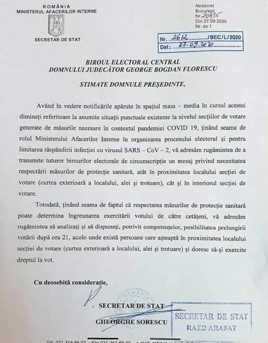 „Ținând cont de îngreunarea exercitării votului pentru respectarea măsurilor de protecţie sanitară, vă adresăm rugămintea să analizaţi şi să dispuneţi posibilitatea prelungirii votării după ora 21.00, acolo unde există persoane care aşteaptă în proximitatea localului secţiei de votare (curtea exterioară a localului, alei și trotuare) și doresc să își exercite dreptul la vot”, cere MAI, într-o notă semnată de secretarul de stat Gheorghe Sorescu.