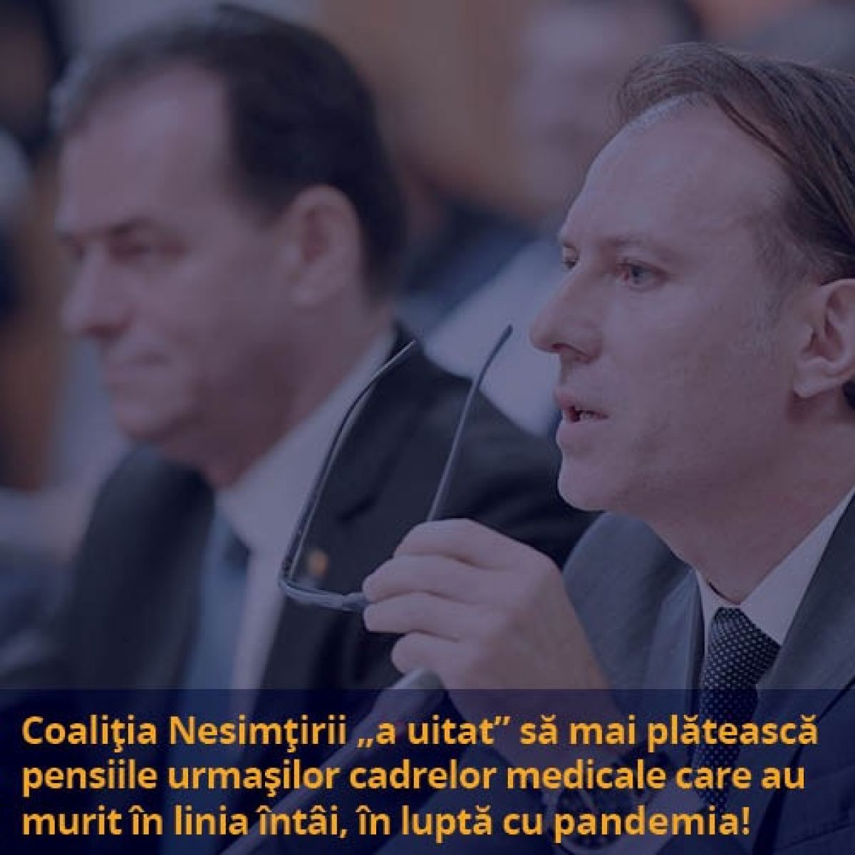 „Coaliția de guvernare refuză acordarea pensiei celor 133 de urmași ai medicilor și asistenților decedați în linia întâi în lupta cu pandemia. 6 dintre cei îndreptățiți sunt chiar din Botoșani. Motivul refuzului se regăsește în răspunsul primit la întrebarea pe care i-am adresat-o premierului: nu a fost stabilită „instituția competentă în stabilirea și plata acestor drepturi”,