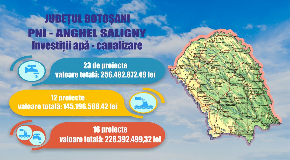 Parlamentarul botoșănean Alexandra Huțu, membru în Comisia pentru Administrație Publică și Comisia pentru Mediu din Camera Deputaților, a anunțat că din cele 127 de obiective de investiții ce vor fi realizate în județul Botoșani prin programul Anghel Saligny, 51 de proiecte vizează investiții în realizarea și extinderea rețelelor de apă și canalizare în 44 de localități. Valoarea acestora este de peste 630 de milioane de lei, adică aproximativ 130 de milioane de euro.