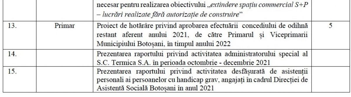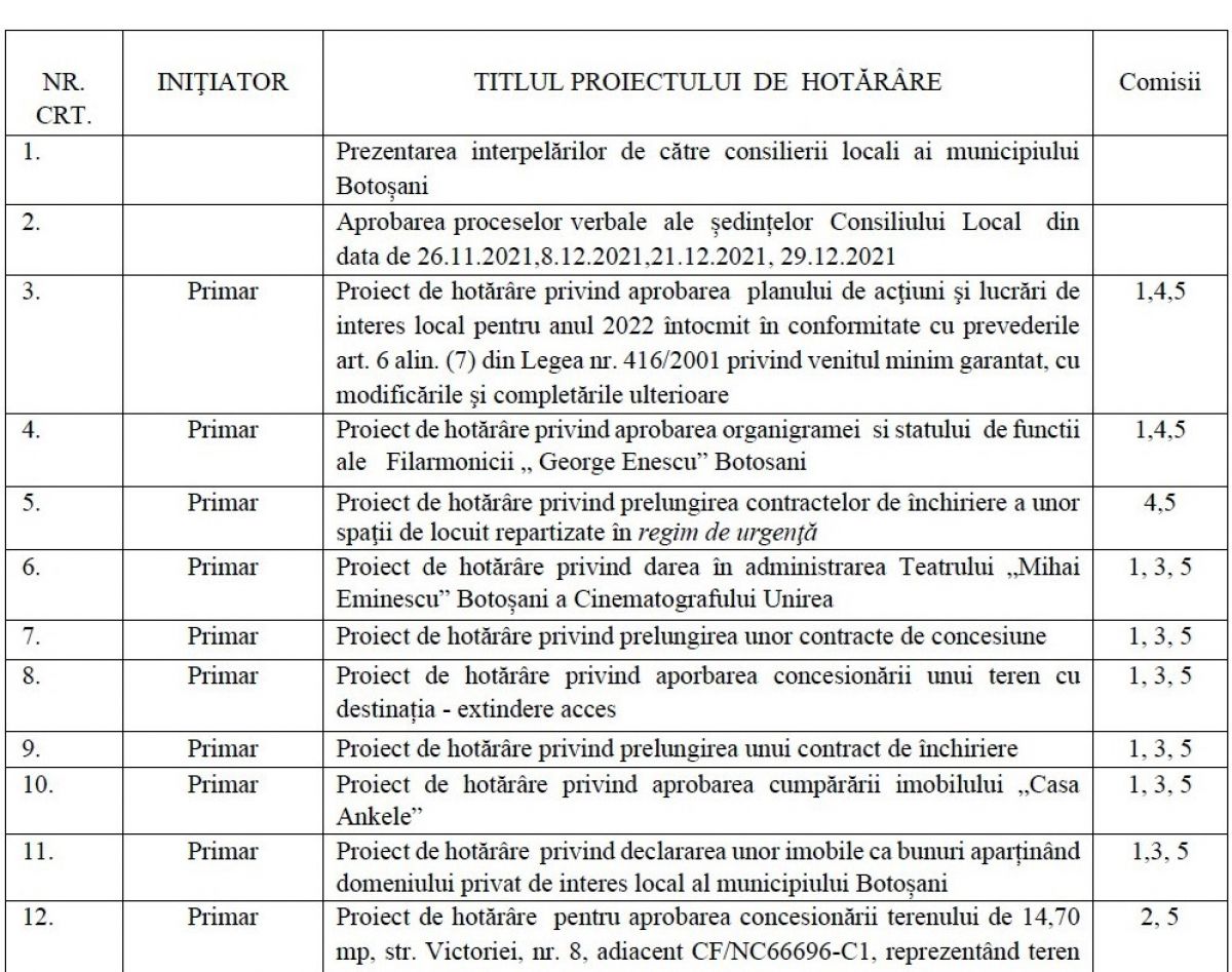 „Se convocă, în şedinţă ordinară, Consiliul Local al Municipiului Botoşani, pentru data de 27.01.2022, ora 10,00 în sala de ședințe „Mihai Eminescu” din sediul Primăriei.