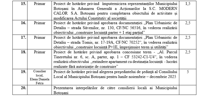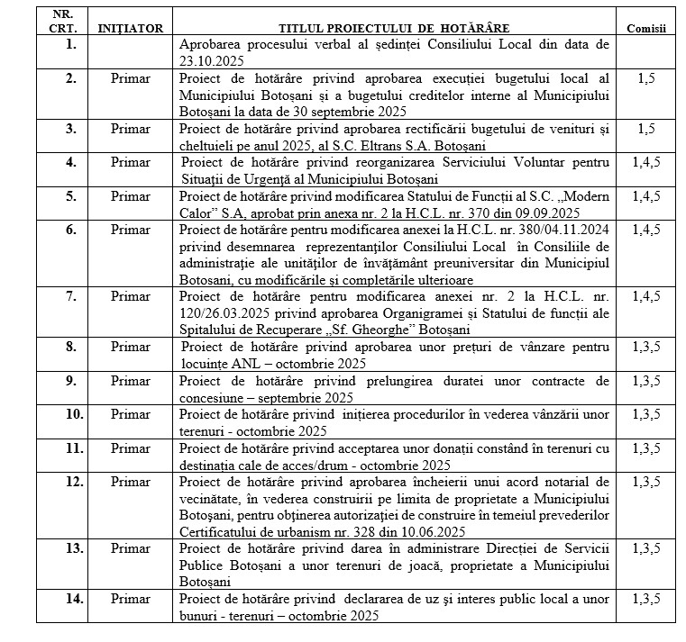 Se convocă, în şedinţă ordinară, Consiliul Local al Municipiului Botoşani, pentru data de 30.10.2025, ora 11,00, în sala de ședințe „Mihai Eminescu” din sediul Primăriei.
