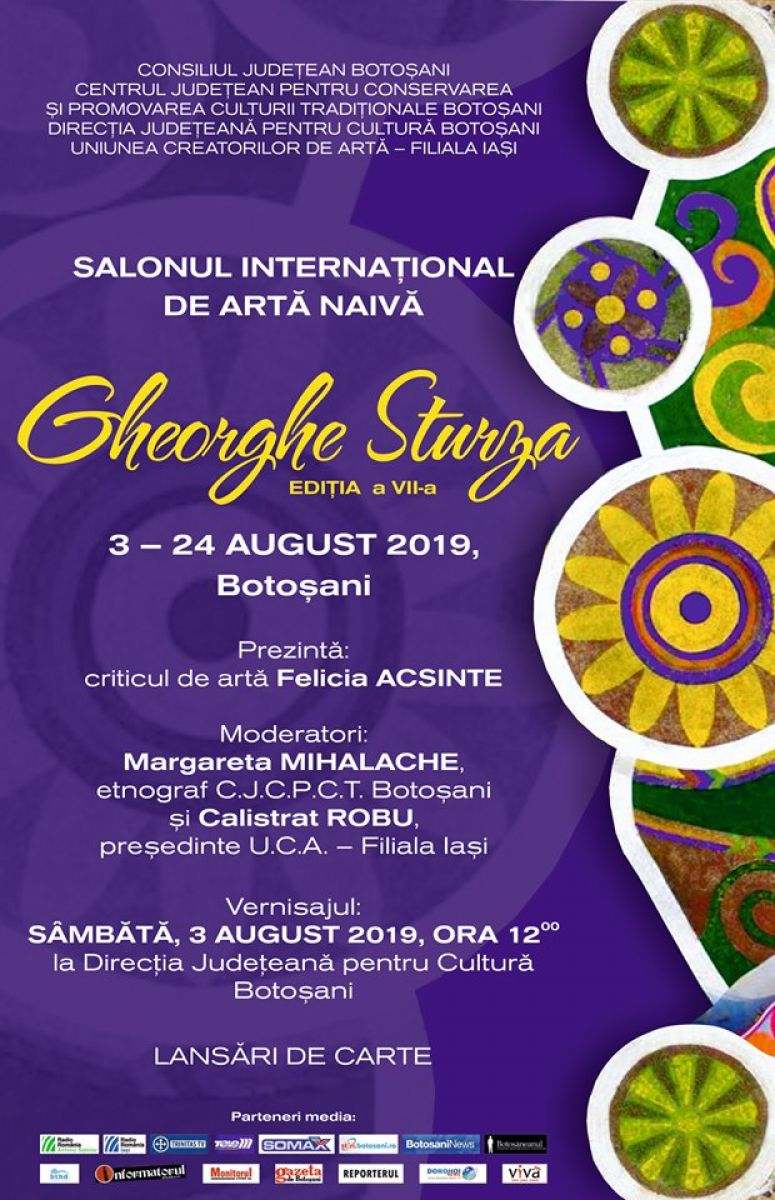 Centrul Județean pentru Conservarea și Promovarea Culturii Tradiționale Botoșani, cu sprijinul Consiliului Județean Botoșani, având drept parteneri Direcția Județeană pentru Cultură Botoșani și Uniunea Creatorilor de Artă-Filiala Iași, organizează cea de a VII-a ediție a Salonului Internațional de Artă Naivă “Gheorghe Sturza”, în perioada 3-24 august 2019.