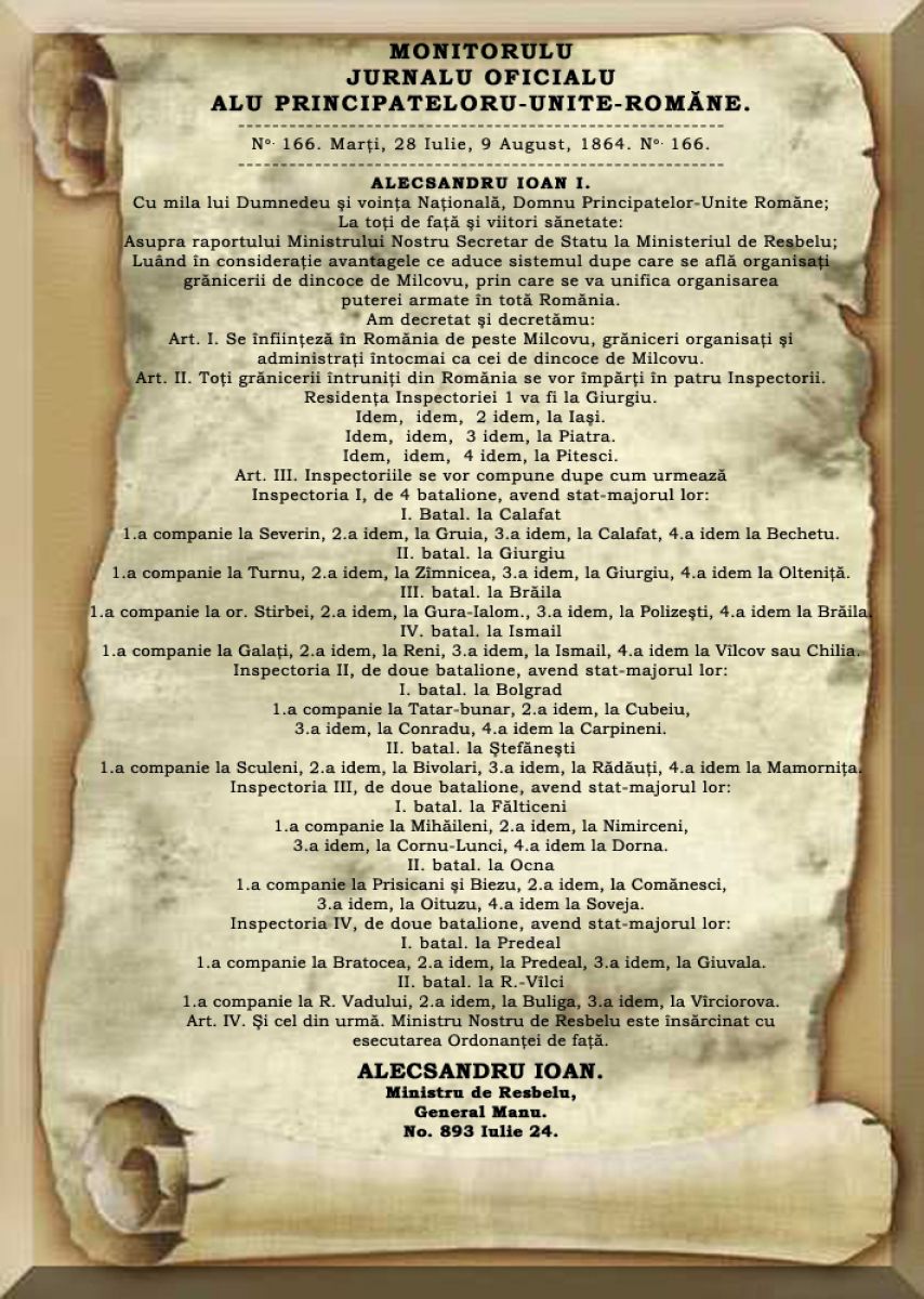 Prin Înaltul Decret Domnesc numărul 893 din 24 iulie 1864 al domnitorului Alexandru Ioan Cuza se prevedea organizarea grănicerilor din Moldova după modelul celui din Țara Românească și unirea celor două corpuri grănicerești.