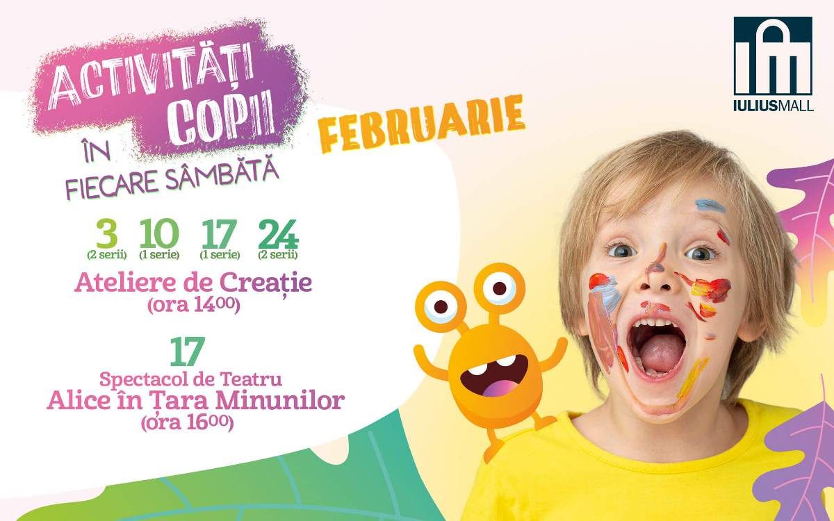 La Iulius Mall Suceava, pe tot parcursul lunii februarie, dar și în următoarele luni, copiii sunt așteptați de Creativ&Deco și Teatro Blu, în fiecare sâmbătă, cu jocuri, muzică și dans, spectacole de teatru și ateliere de creație. Universul ludic, ”echipat” pentru activități creative, îi întâmpină pe micuți cu sesiuni distractive, exerciții de imaginație și multă voie bună.