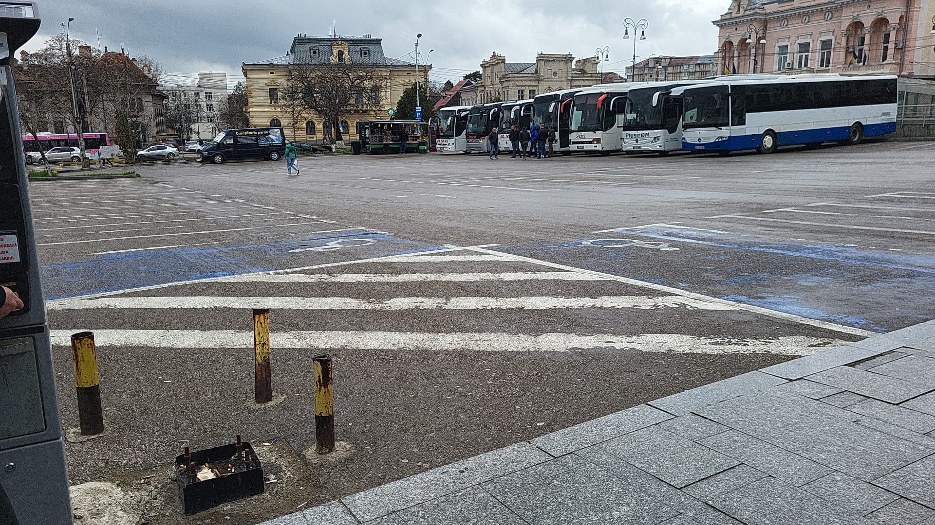Pot fi observate mai multe autocare parcate în zonă.