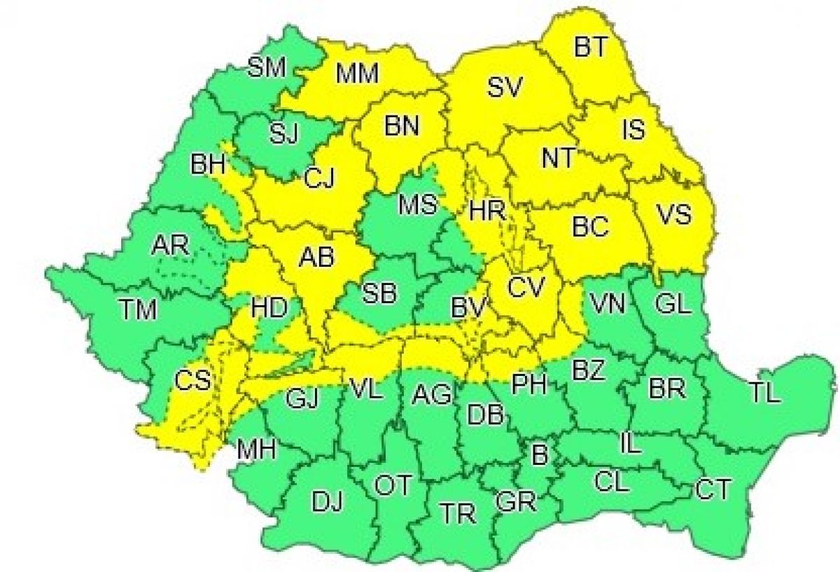 Administrația Națională de Meteorologie a emis o atenționare de tip Cod Galben pentru mai multe județe, printre care și Botoșani.