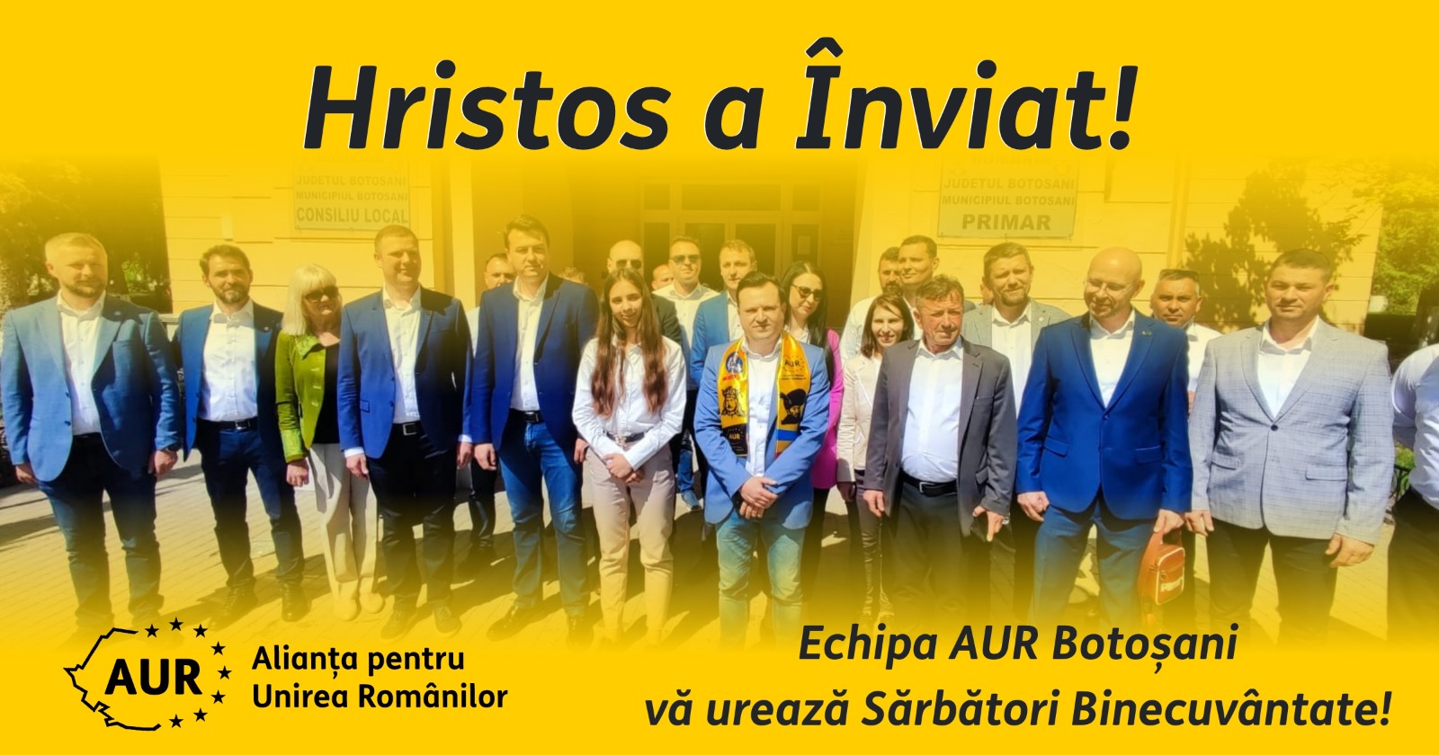 În numele Partidului AUR Botoșani, vă transmitem cele mai calde urări de bine cu ocazia Sfintelor Sărbători de Paște. Aceasta este o perioadă de reflecție, speranță și reînnoire, iar noi sperăm că veți petrece aceste momente speciale alături de cei dragi, în pace și armonie.