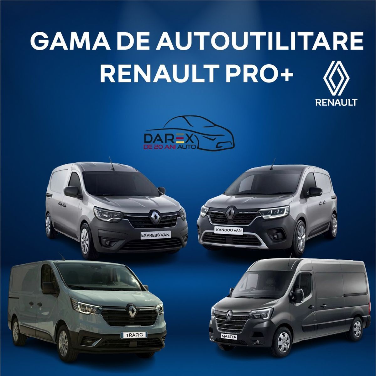Vehiculul joacă un rol important în activitatea ta profesională? Darex Auto prezintă o soluție personalizată pentru orice afacere de succes – gama de autoutilitare Renault Pro+. Printre vehiculele utilitare accesibile se numără Renault Kangoo Van, Renault Express Van, Renault Trafic Van și Renault Master.