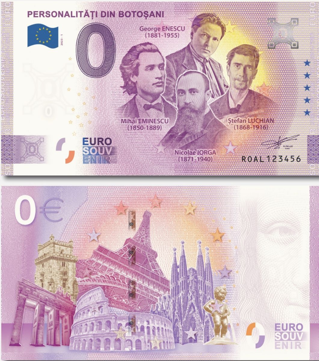 Muzeul Județean Botoșani anunță cu încântare succesul cultural și comercial notabil al bancnotei suvenir de 0 euro „Personalități din Botoșani”, lansată oficial la finalul lunii august 2023, în cadrul unei serii tipărite cu aprobarea Băncii Naționale a Franței, securizată la standardele impuse de Banca Central Europeană și similară structural bancnotelor reale.