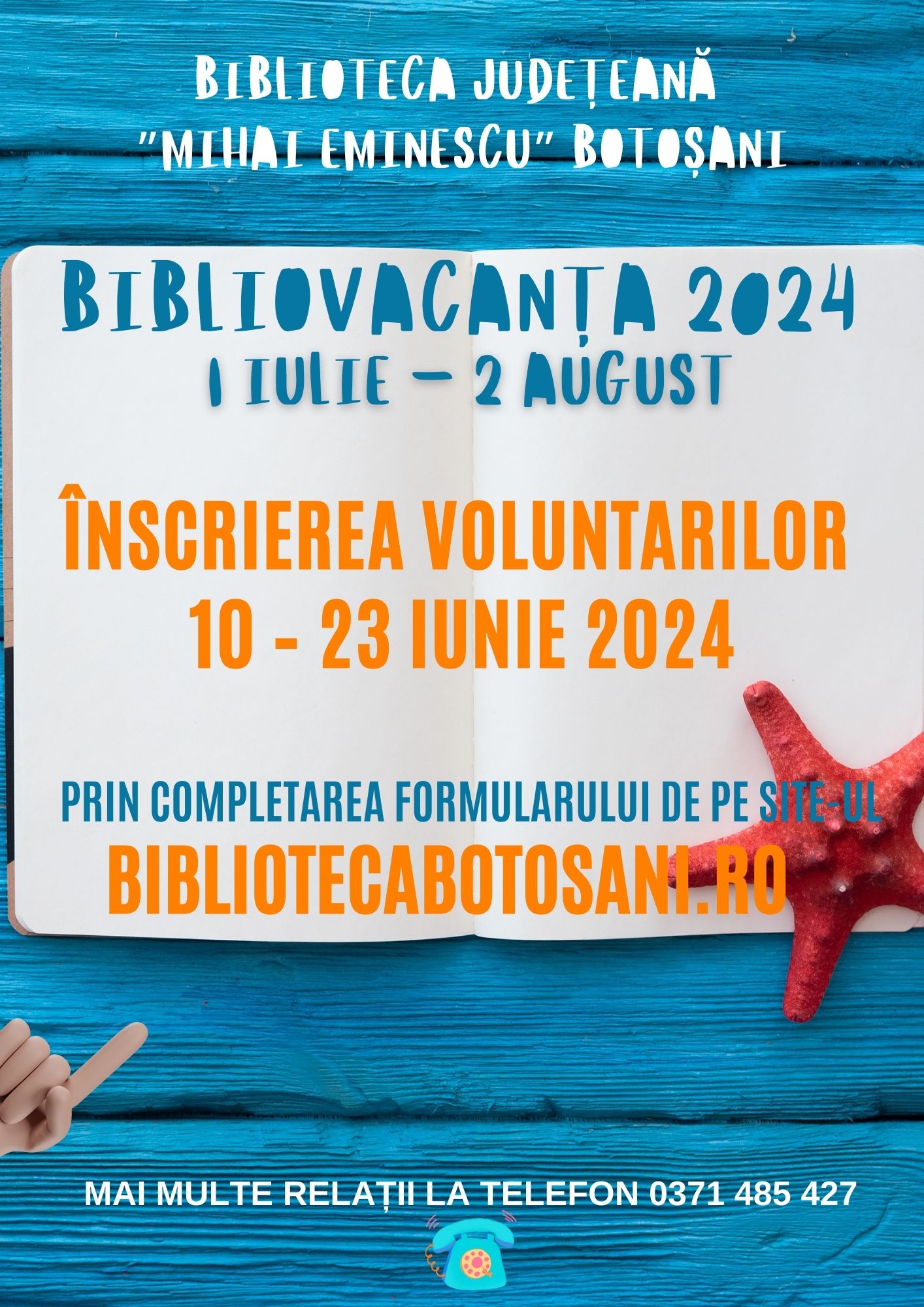 Biblioteca Județeană „Mihai Eminescu” Botoșani demarează înscrierile pentru Corpul de voluntari care vor susține cursuri în cadrul programului BiblioVacanța de anul acesta ce se va desfășura în perioada 1 iulie - 2 august 2024 (5 săptămâni).