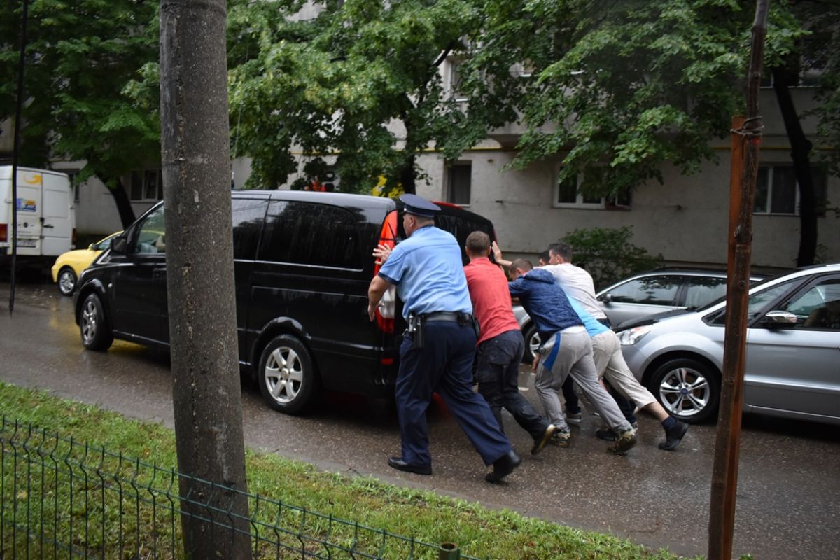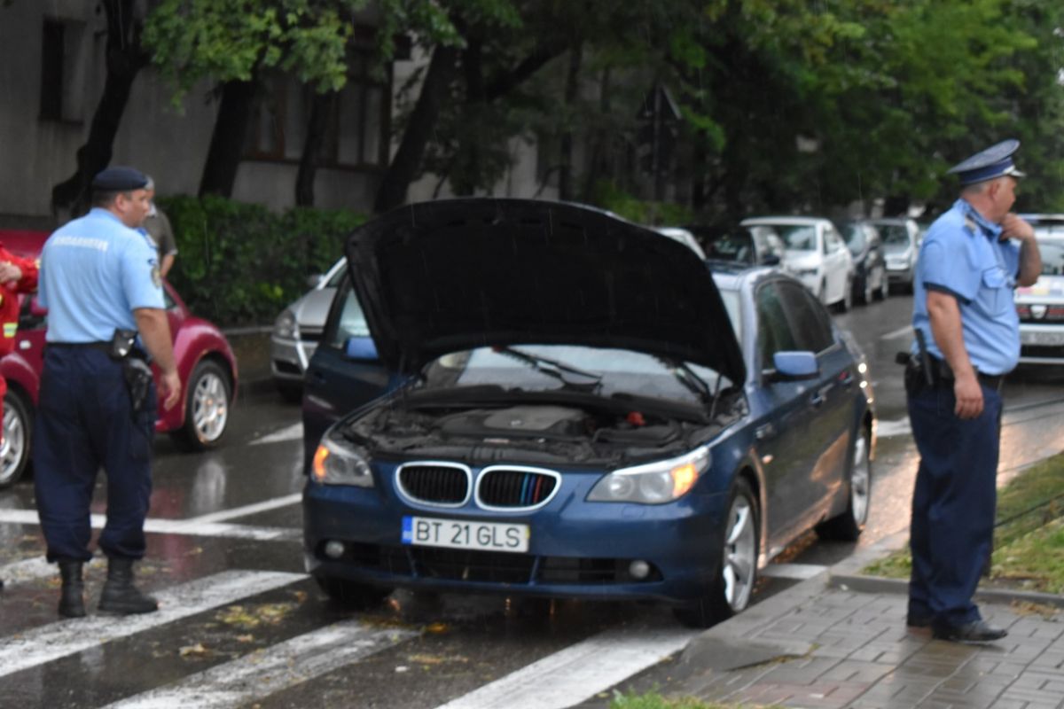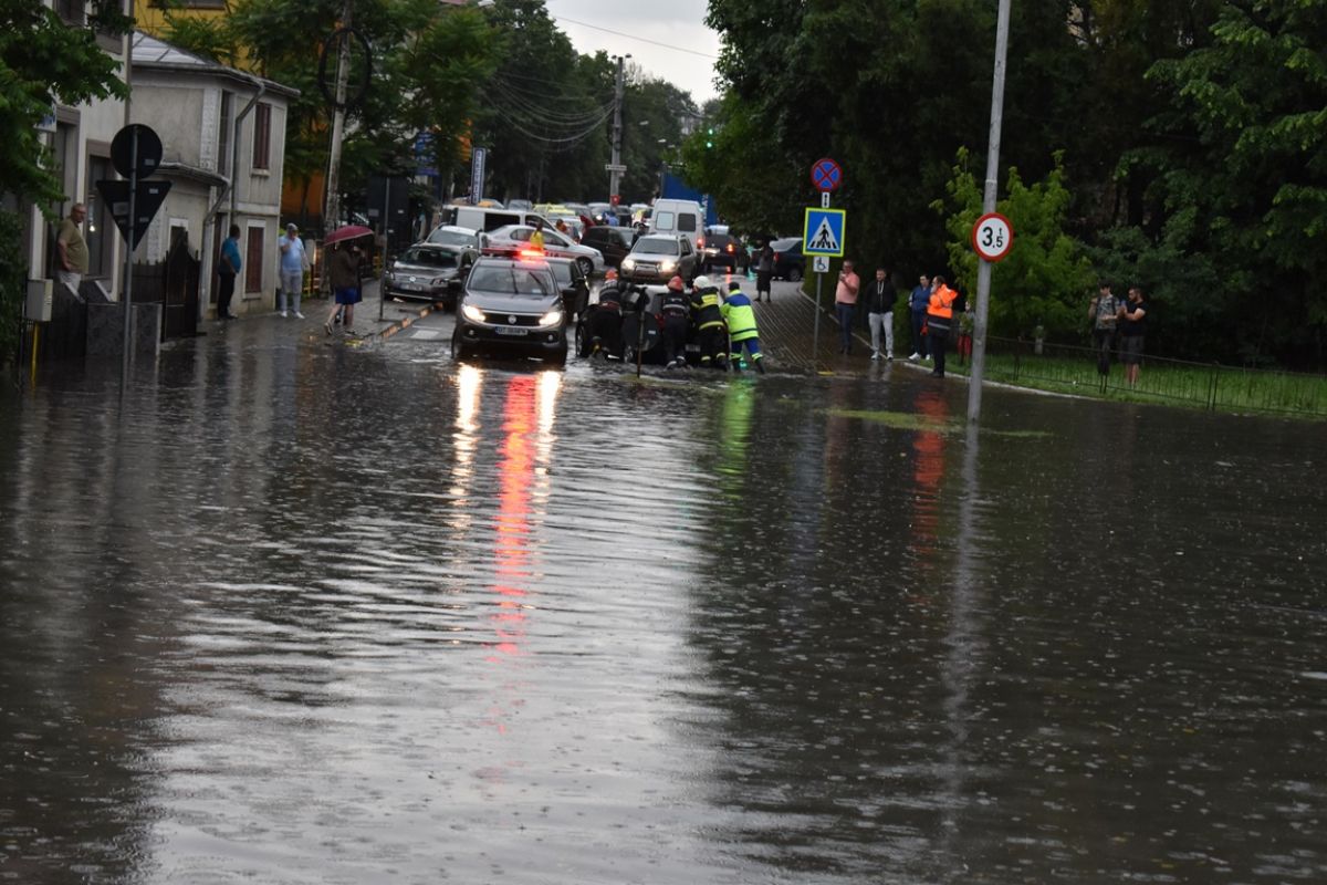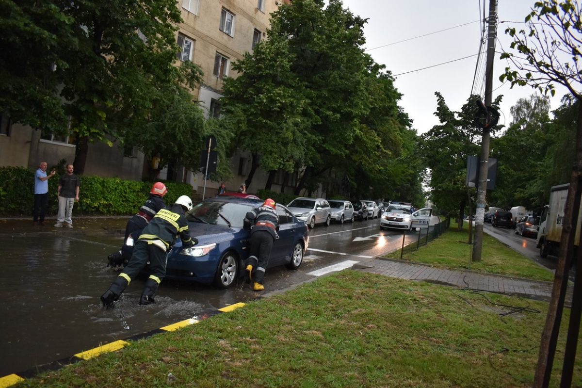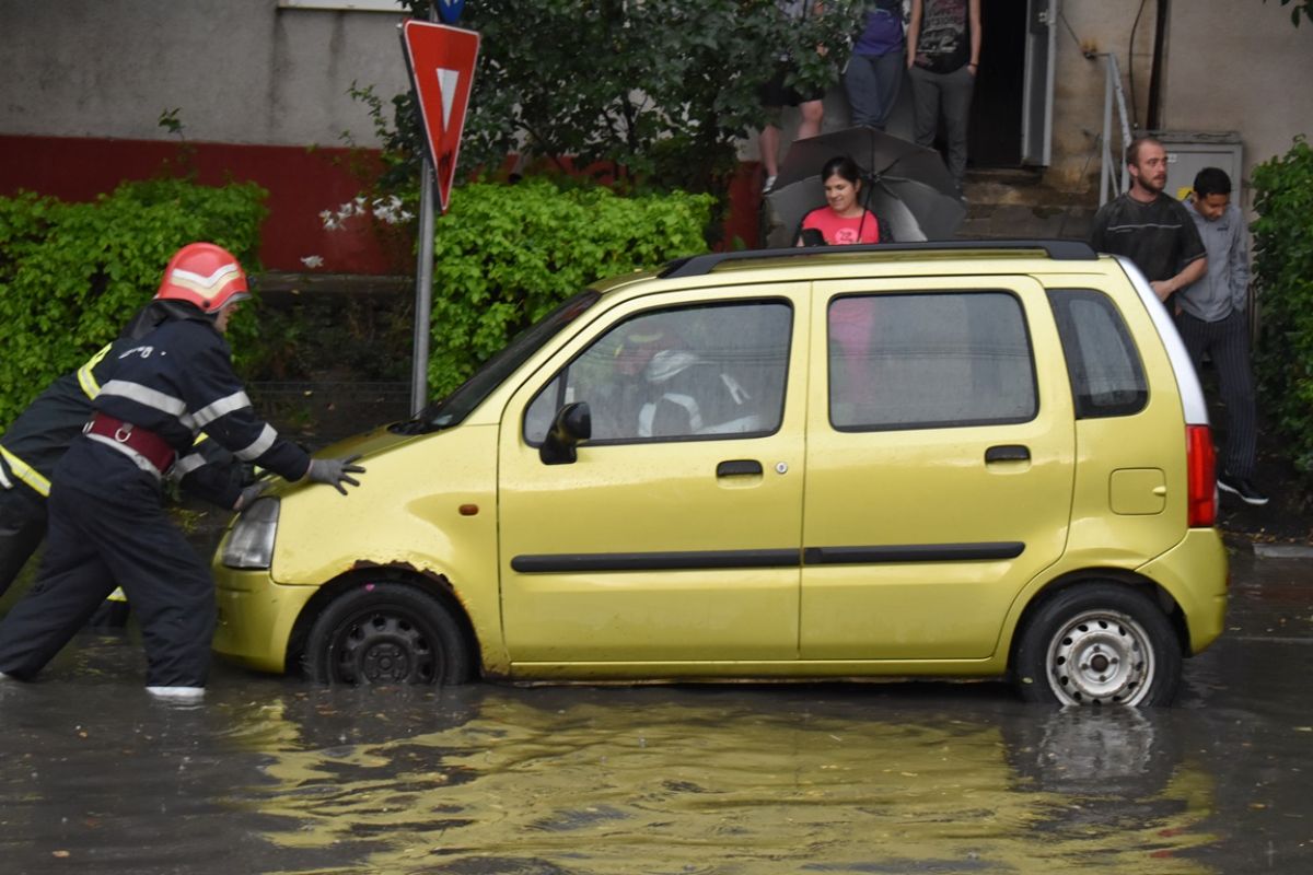 O mulțime de șoferi au făcut cale întoarsă. Nu chiar toți însă! Printre cei care s-au încumetat să traverseze intersecția s-a regăsit și conducătorul auto dintr-un BMW, care a rămas blocat în mijlocul bălții, fiind împins pe... uscat de mai mulți pompieri.