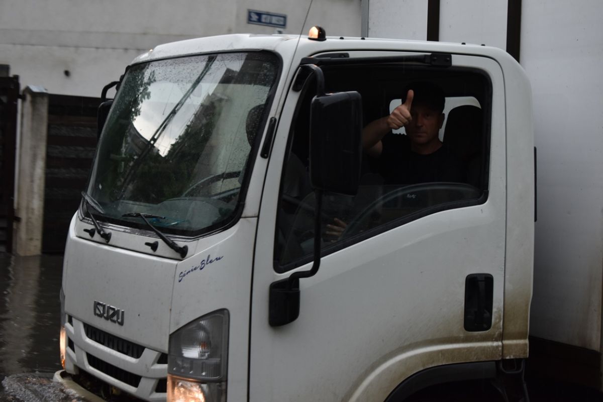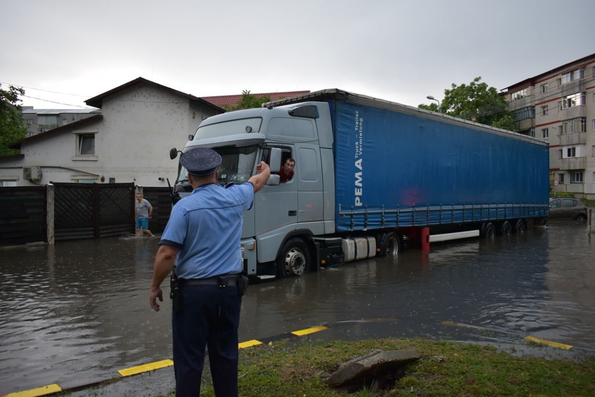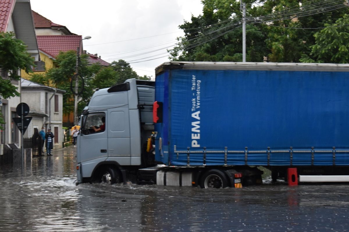 Necunoscând zona, șoferul unui camion din Argeș a încercat la rândul lui să o traverseze, dar s-a oprit pe la jumătate. A fost nevoit să bage marșarier și să urce pe Octav Onicescu.