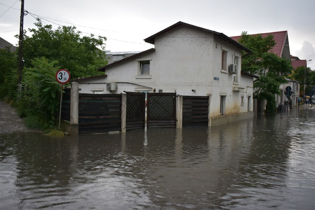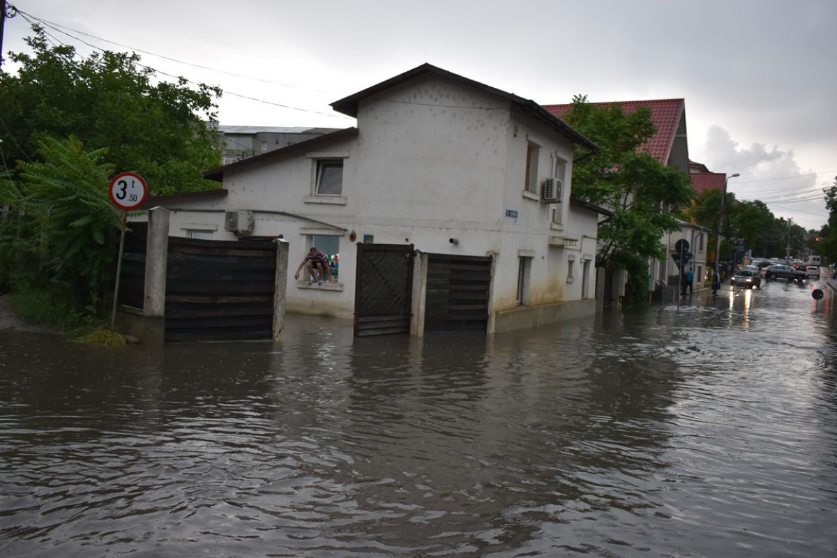 Apa a trecut peste trotuare și a intrat în curțile unor case din apropiere, care s-au umplut de apă în câteva minute. Unul dintre locatarii de acolo a fost nevoit să sară pe geam pentru a reuși să închidă poarta.
