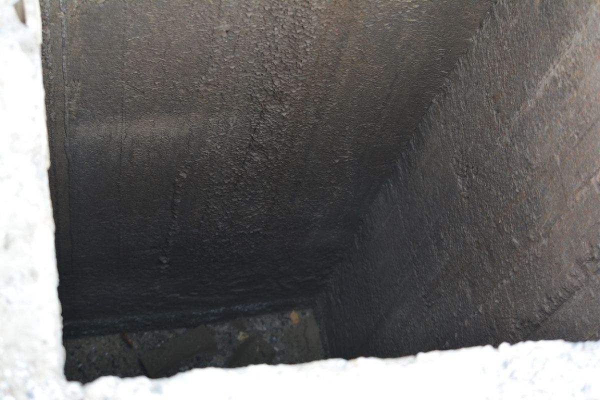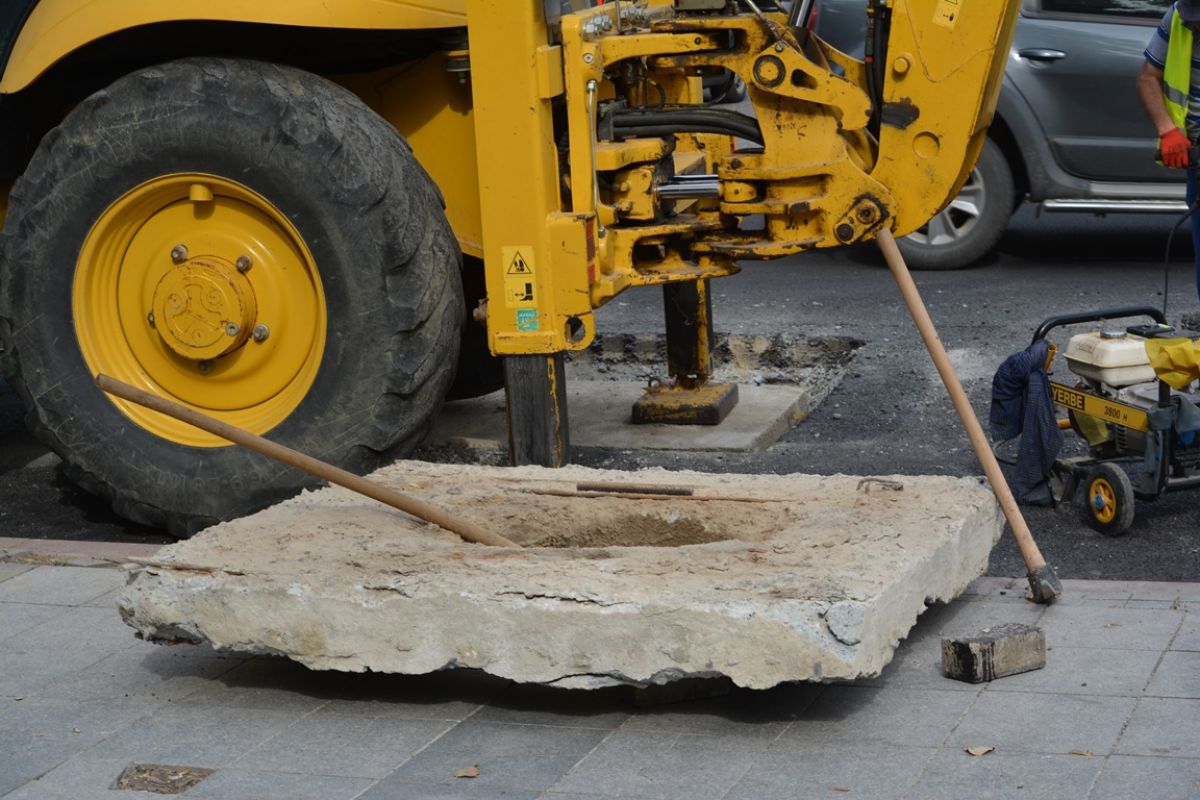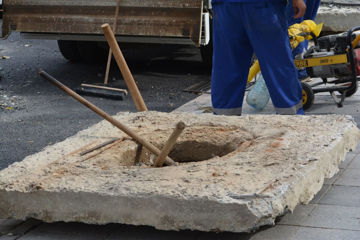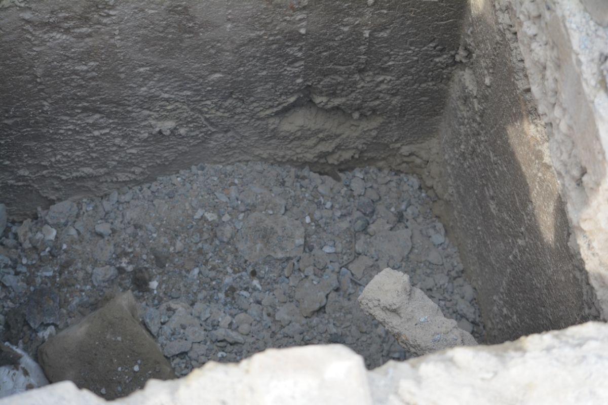 Structura de beton fusese deja îndepărtată astfel încât se putea vedea canalizarea la o adâncime de aproximativ doi metri.