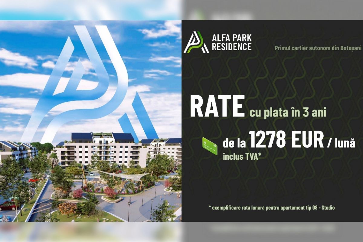 (P) Începând de la o rată lunară de 1278 de Euro, cu plata în trei ani, poți deveni proprietar al unei locuințe noi în primul cartier autonom din Botoșani - Alfa Park Residence