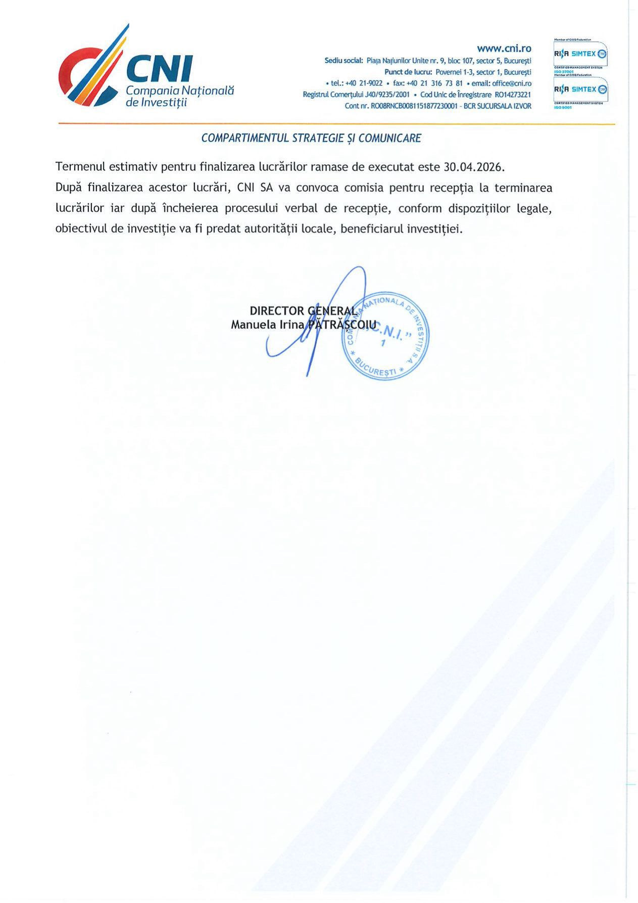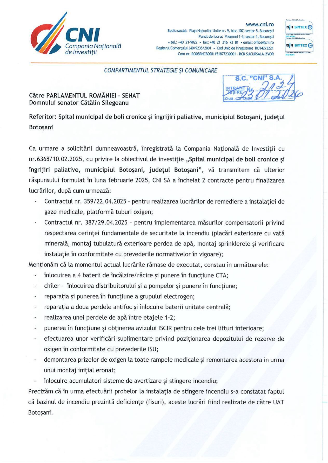Compania Națională de Investiții (CNI) amână pentru luna aprilie 2026 recepția Spitalului de Boli Paliative din municipiul Botoșani, din cauza unor deficiențe tehnice constatate la lucrări, se arată în răspunsul transmis senatorului Cătălin Silegeanu la o interpelare parlamentară.
