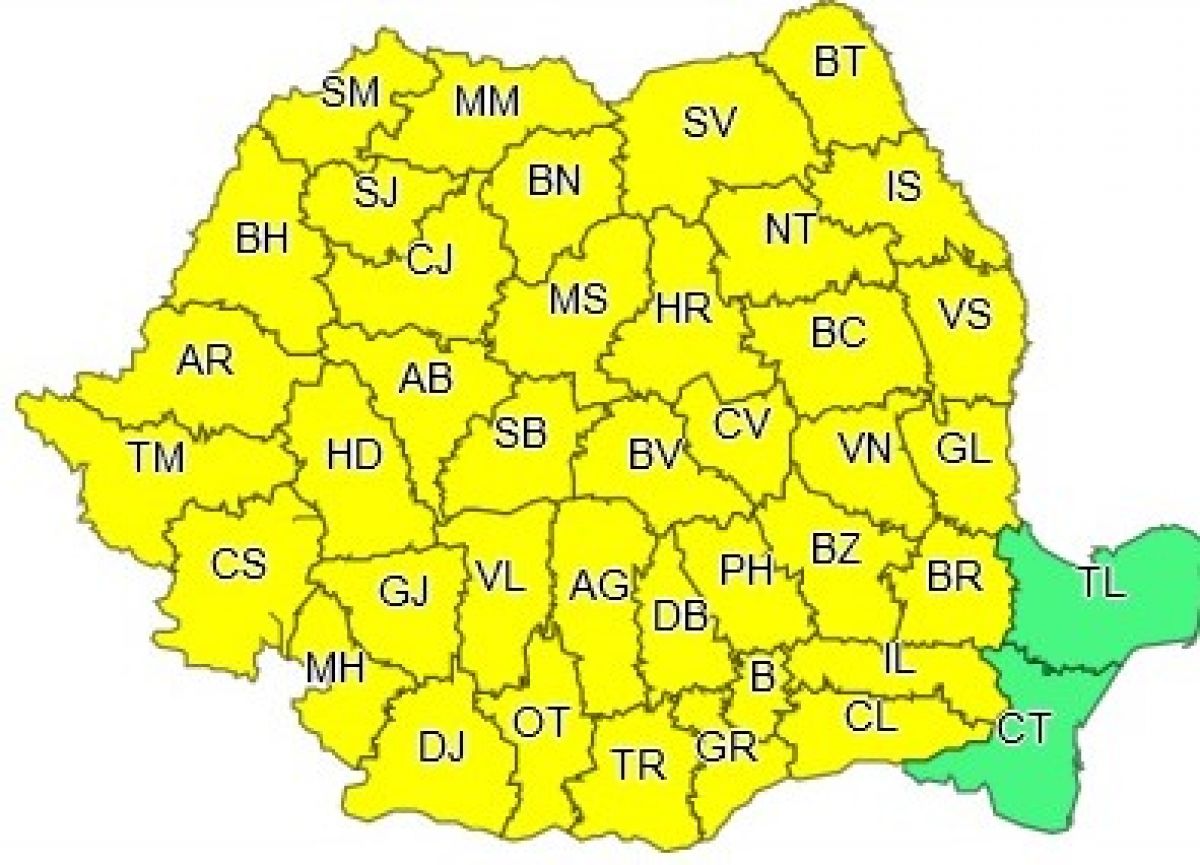 Administrația Națională de Meteorologie a emis o atenționare de tip Cod Galben care intră în vigoare astăzi, de la ora 12.00.