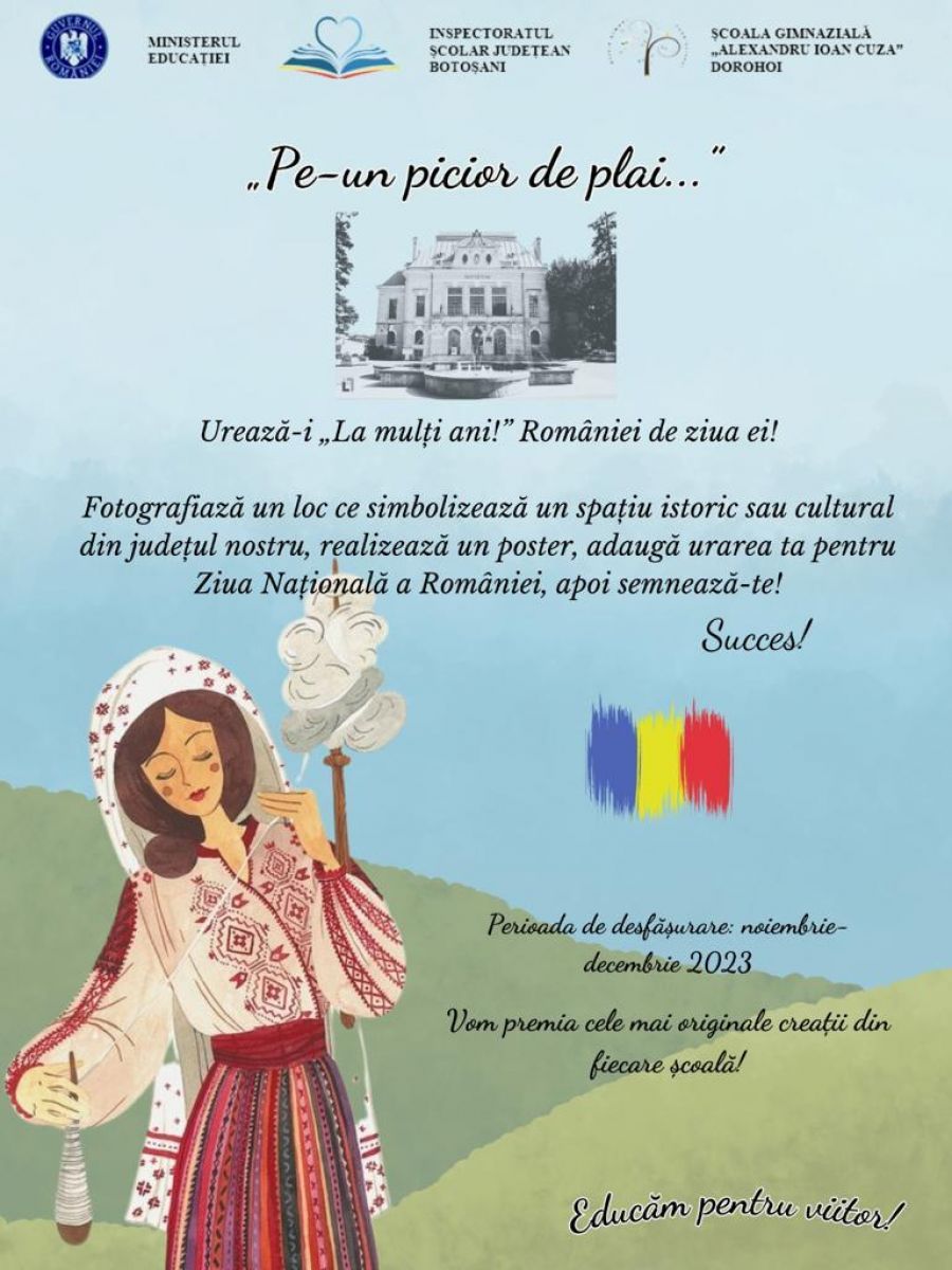 Inspectoratul Școlar Județean Botoșani, în parteneriat cu Școala Gimnazială „Alexandru Ioan Cuza” Dorohoi, lansează proiectul educațional județean „Pe-un picior de plai...”, dedicat Zilei Naționale a României.