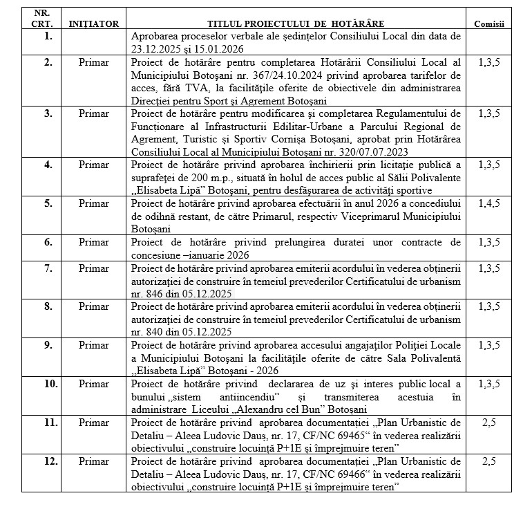 Se convocă, în şedinţă ordinară, Consiliul Local al Municipiului Botoşani, pentru data de 29.01.2026, ora 11,00, în sala de ședințe „Mihai Eminescu” din sediul Primăriei.