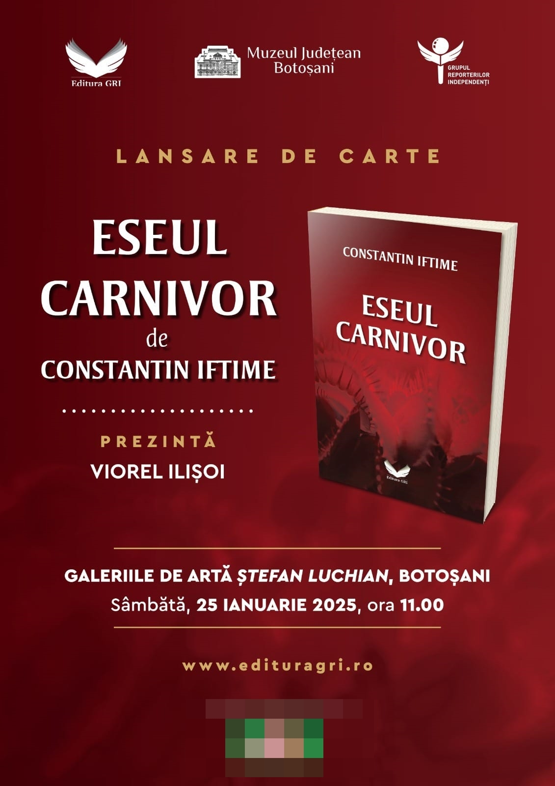 Muzeul Județean Botoșani găzduiește sâmbătă, 25 ianuarie 2025, ora 11.00, în spațiul Galeriilor de Artă ,,Ștefan Luchianˮ, lansarea volumului ,,Eseul carnivorˮ, semnat de scriitorul botoșănean Constantin Iftime.