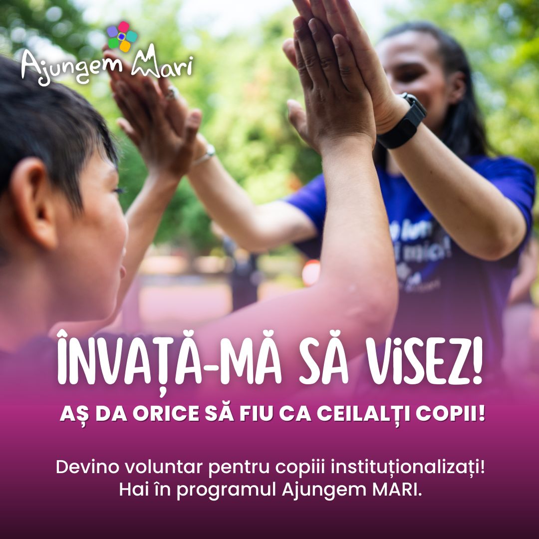 Ajungem MARI, cel mai mare program educaţional din România dedicat copiilor din sistemul de protecţie, are în grijă peste 3.000 de copii şi tineri. Pentru ca aceştia să primească în continuare sprijinul necesar este nevoie de 1.000 de voluntari care să îşi asume rolul de mentor şi prieten.