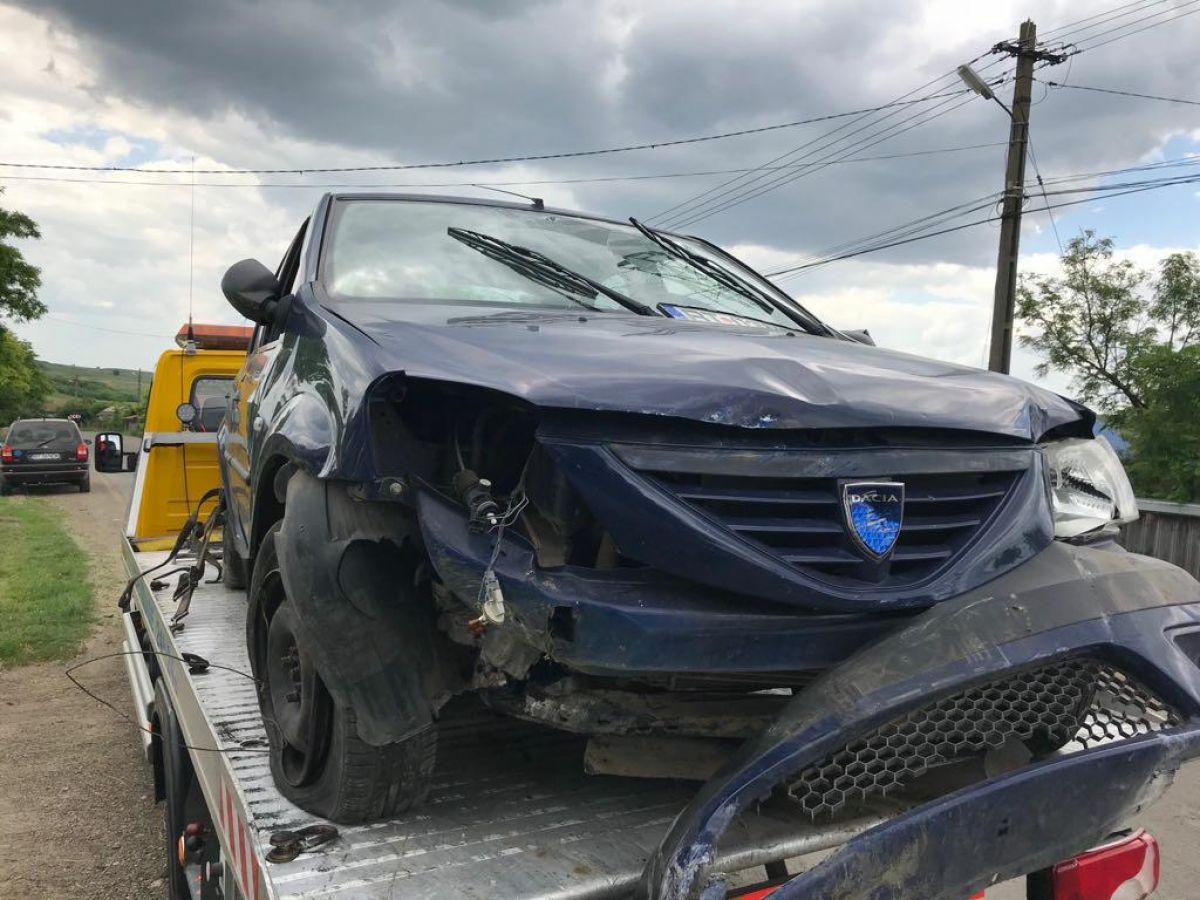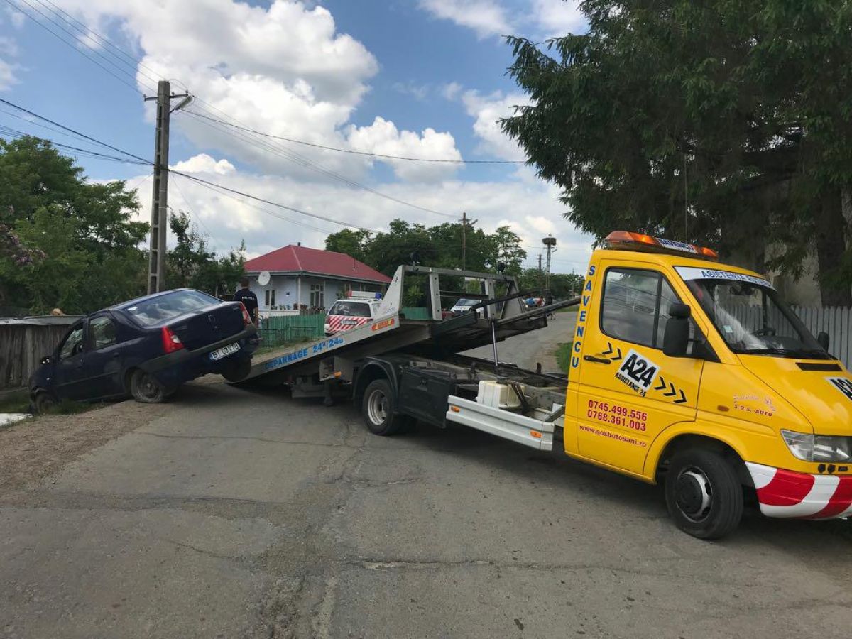 Mașina, o Dacia Logan a fost avariată frontal și preluată după accident de SOS Botoșani, pe o platformă.