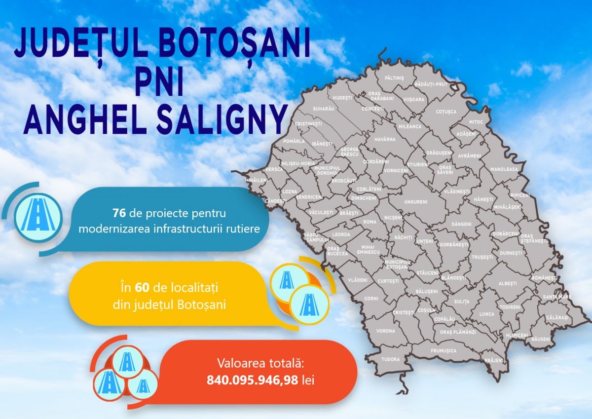 „Avem nevoie în special de investiții în dezvoltarea infrastructurii rutiere, care este încă deficitară în județul nostru. De aceea, am susținut decizia Guvernului de suplimentare a fondurilor pentru programul Anghel Saligny, cu 15,5 miliarde de lei, din care 10 miliarde pentru construcția și modernizarea drumurilor astfel încât, fără excepție, indiferent de culoarea politică a primarului, să fie finanțate toate proiectele depuse de comunitățile locale. În prezent, în Botoșani avem aprobate 76 de proiecte depuse de autoritățile locale ce vizează modernizarea infrastructurii rutiere în 60 de localități, unele cu două sau mai multe proiecte, 5 proiecte la Consiliul Județean și 8 în municipiul Botoșani”,