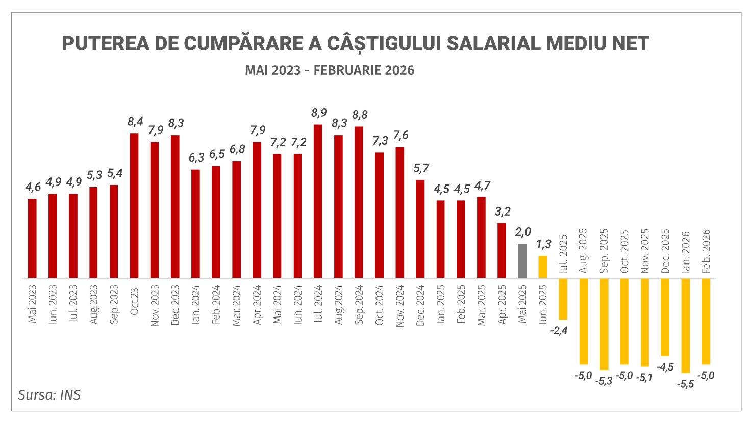 România înregistrează 8 luni consecutive de scădere a puterii de cumpărare a salariaților, cu o depreciere de 8,2%. Profesorii - categorie profesională numeroasă în județul Botoșani - au pierdut 15% din puterea de cumpărare reală. Lucrătorii din sănătate au înregistrat o scădere de 10%, iar funcționarii publici de 14%. Seniorii suferă cea mai mare depreciere a puterii de cumpărare din ultimii 25 de ani, pe fondul dublării inflației - de la 5% la 10% - ca efect direct al creșterii TVA, accizelor și CASS.
