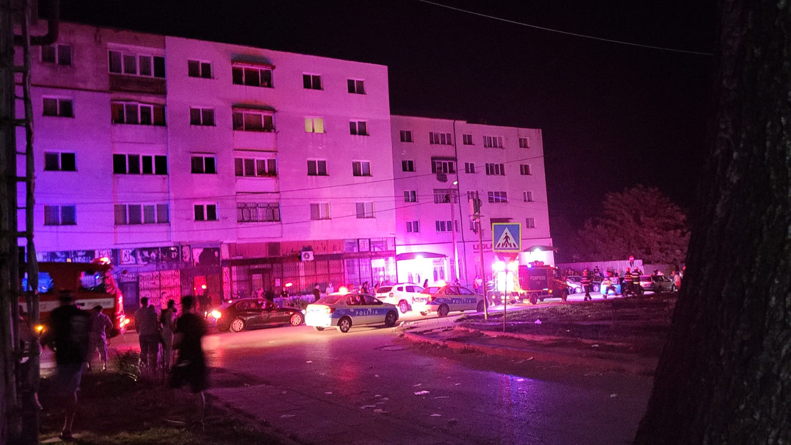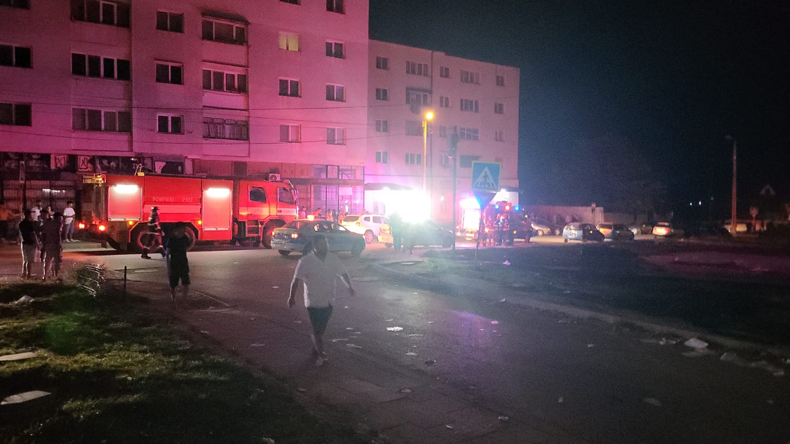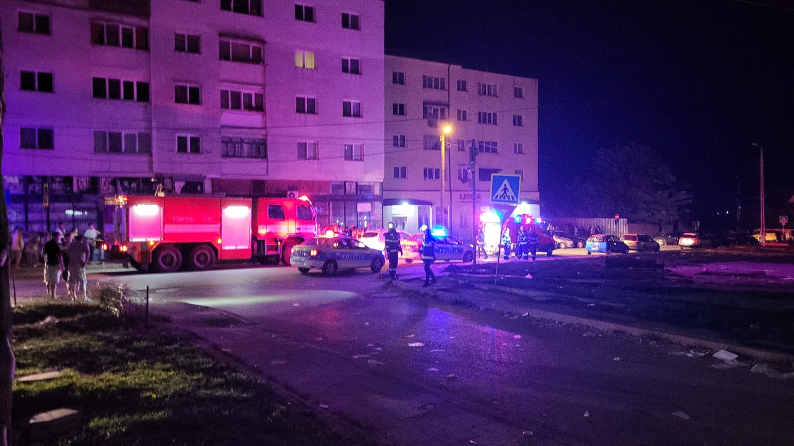 În fața blocului sunt deja două autospeciale ale pompierilor dar și mai multe mașini de Poliție.