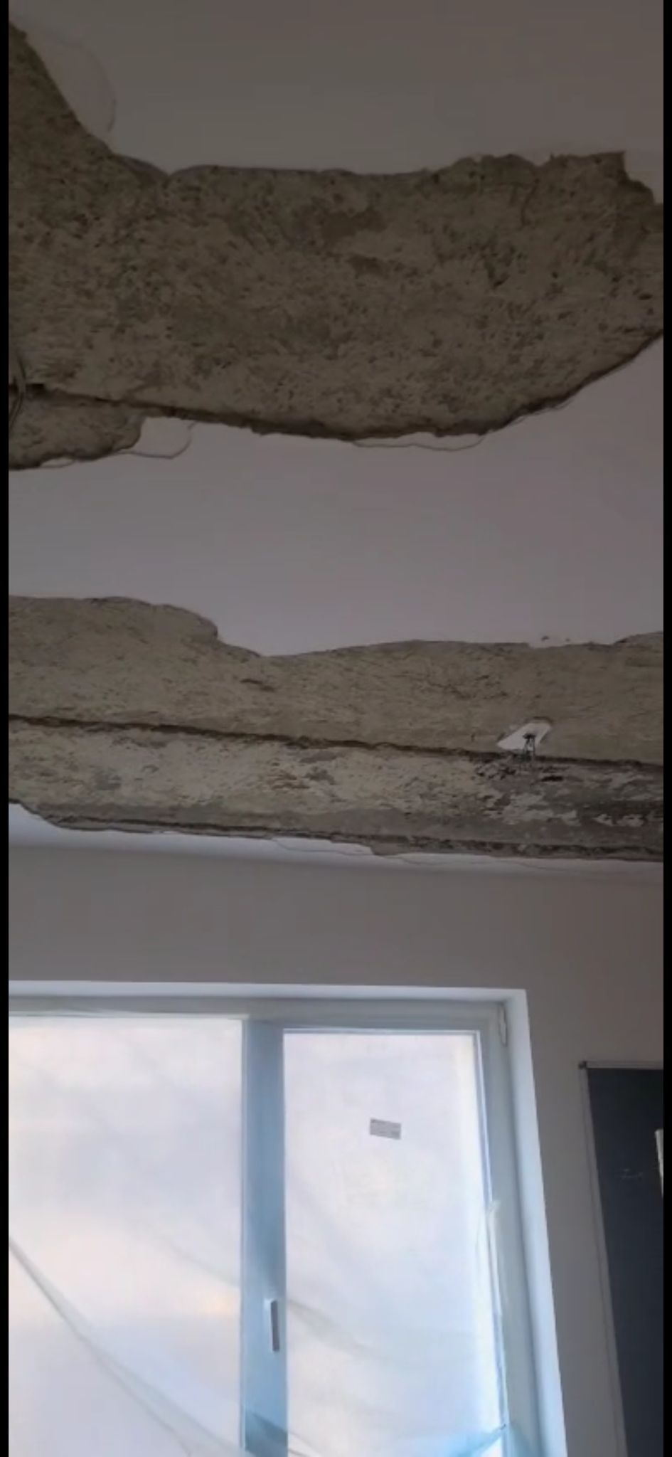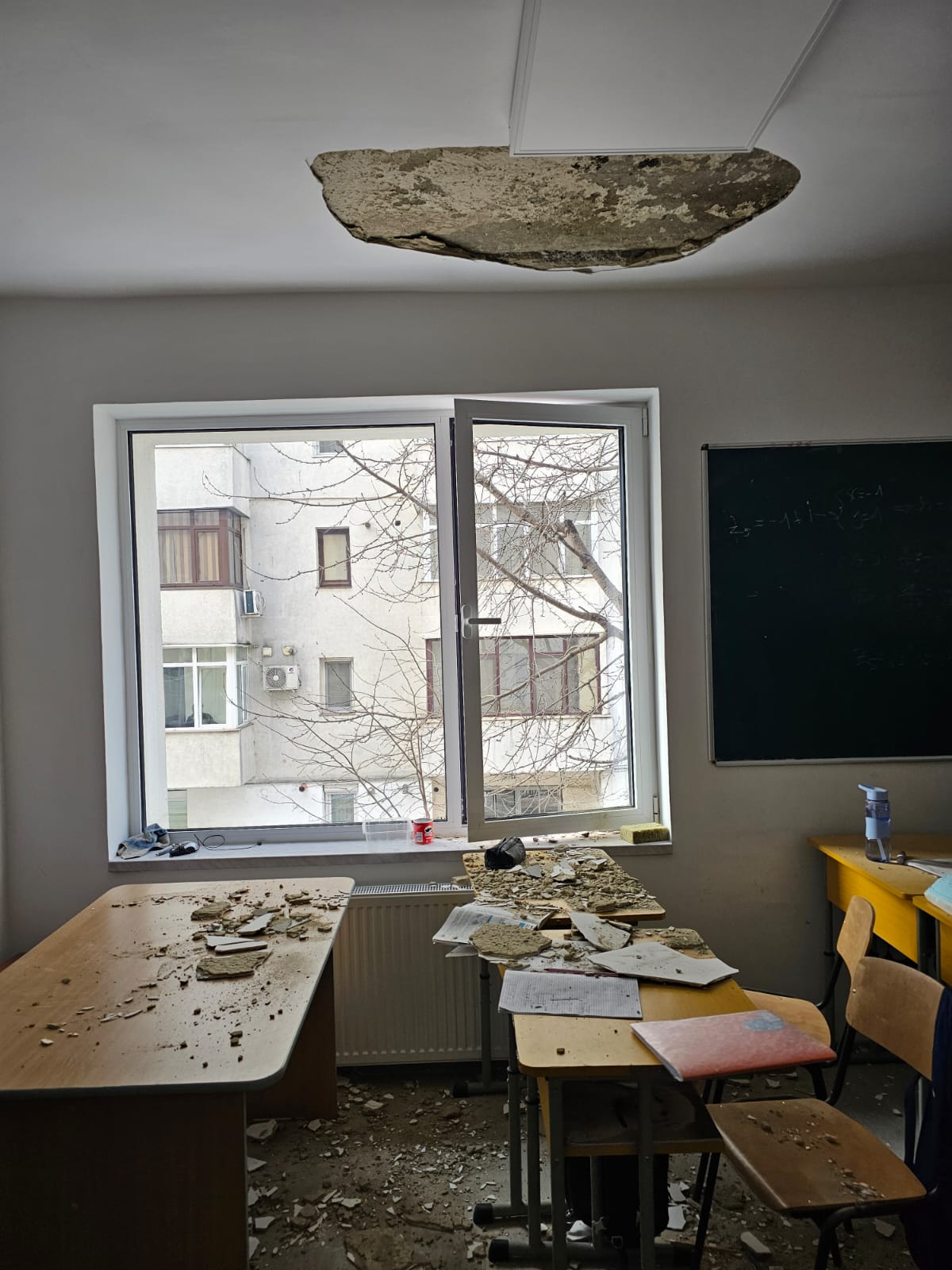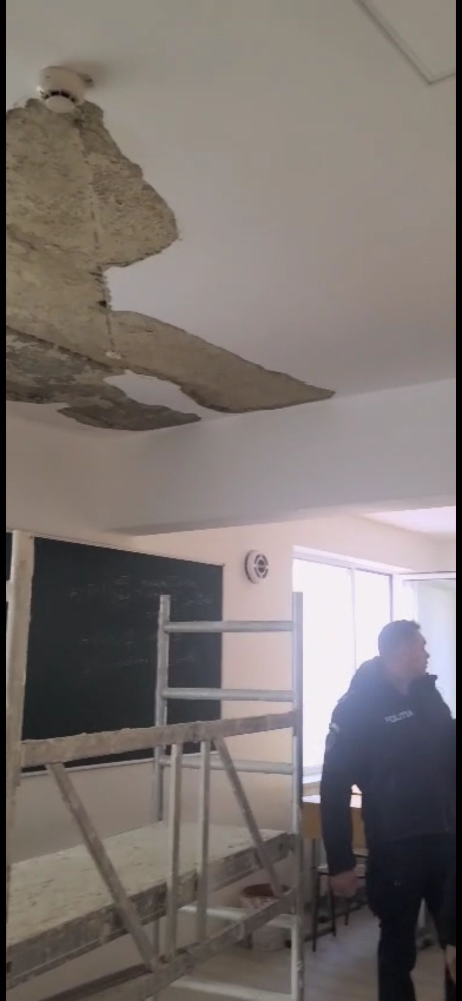 Elevii au fost evacuați imediat după incident. Constructorul care lucrează la Colegiul Mihai Eminescu a intrat în respectiva sală de clasă unde tavanul a căzut între timp în totalitate, după cum se poate observa și în imaginile de mai jos.